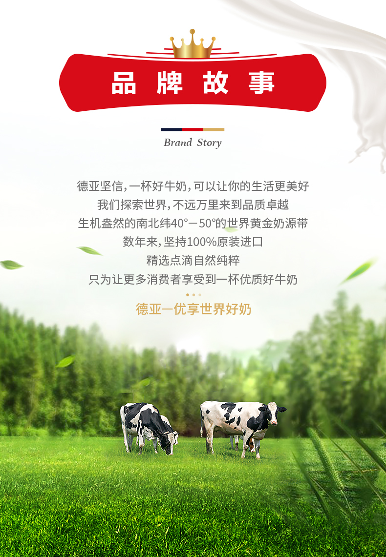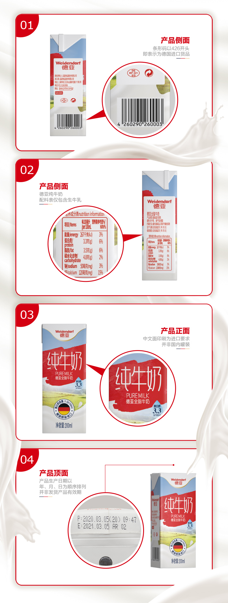 Weidendorf德亚是品利公司的自有品牌,是一家正规的进口食品进口商和经销商,其奶源采自澳大利亚和德国两地。德亚牛奶由德国知名奶产品厂商Hochwald 好沃德代工生产,商品拥有国家颁发的“出入境检验检疫卫生证书”和“中国人民共和国进口货物报关单”。