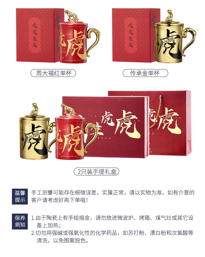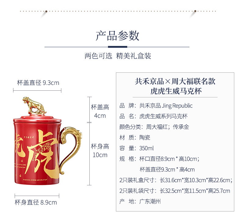 天猫共禾京品旗舰店69.9元,可领30元优惠券,实付39.9元到手,周大福联名虎年限定款马克杯,创意鎏金虎尾手柄+金虎雕像杯盖设计。1280°C高温,瓷质细腻,强度高不易磨损。杯身「虎虎生威」书法藏双虎剪影,虎谐音“福”和“富”,寓意招财纳福步步高升,超高颜值自用送人都不错。