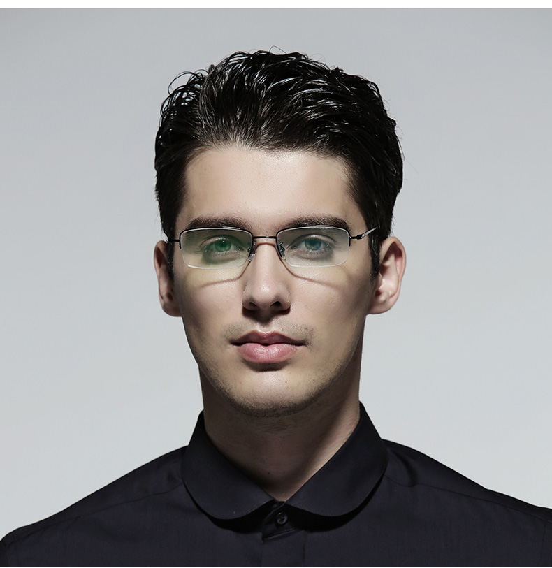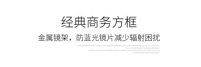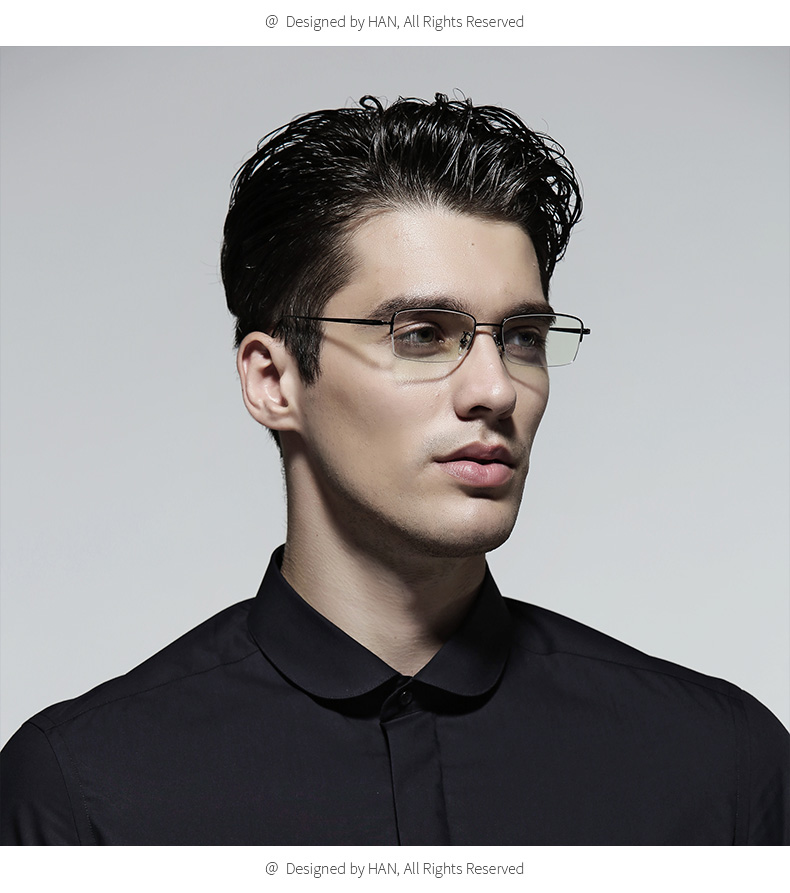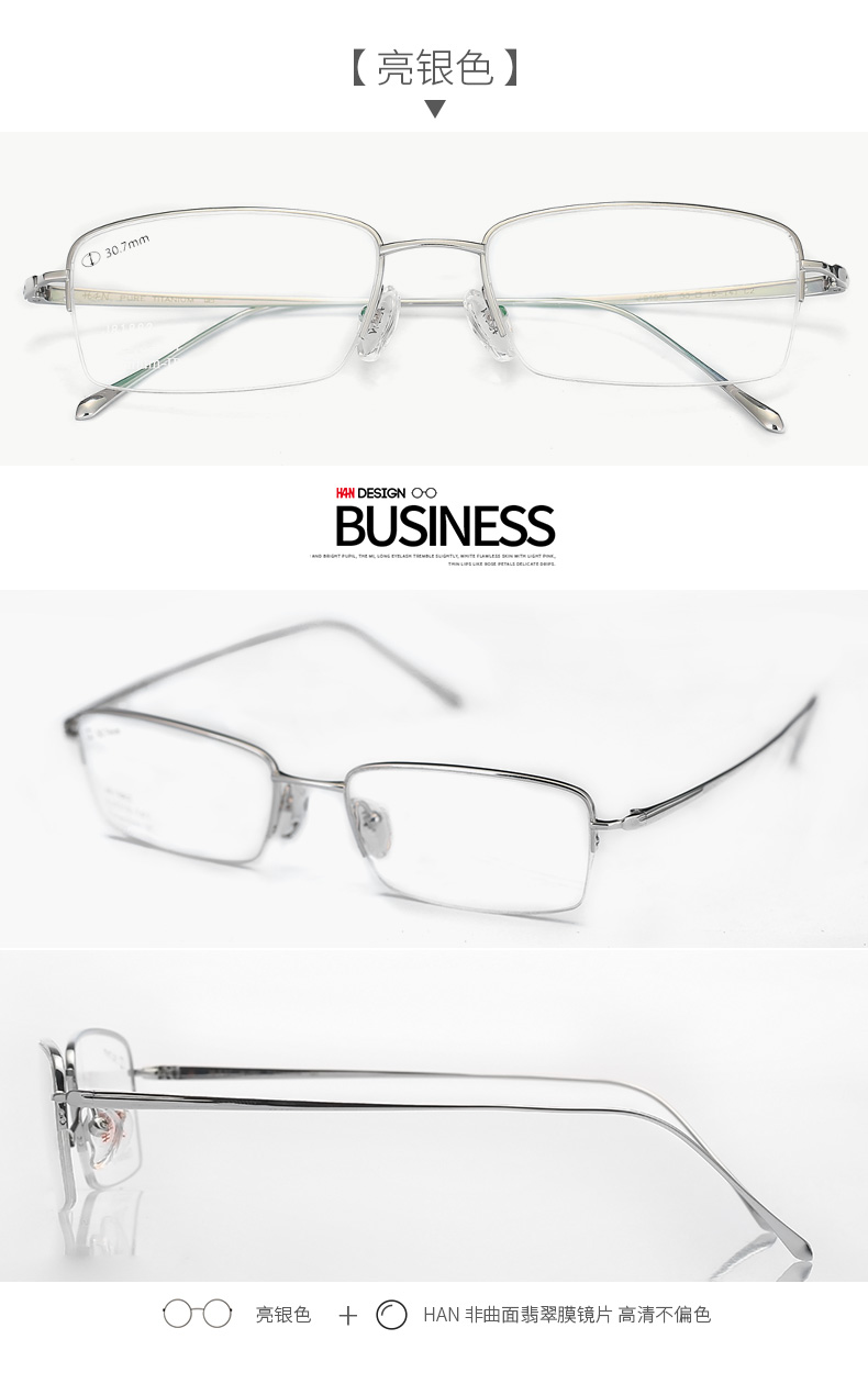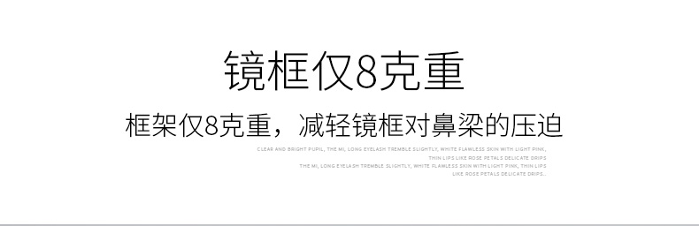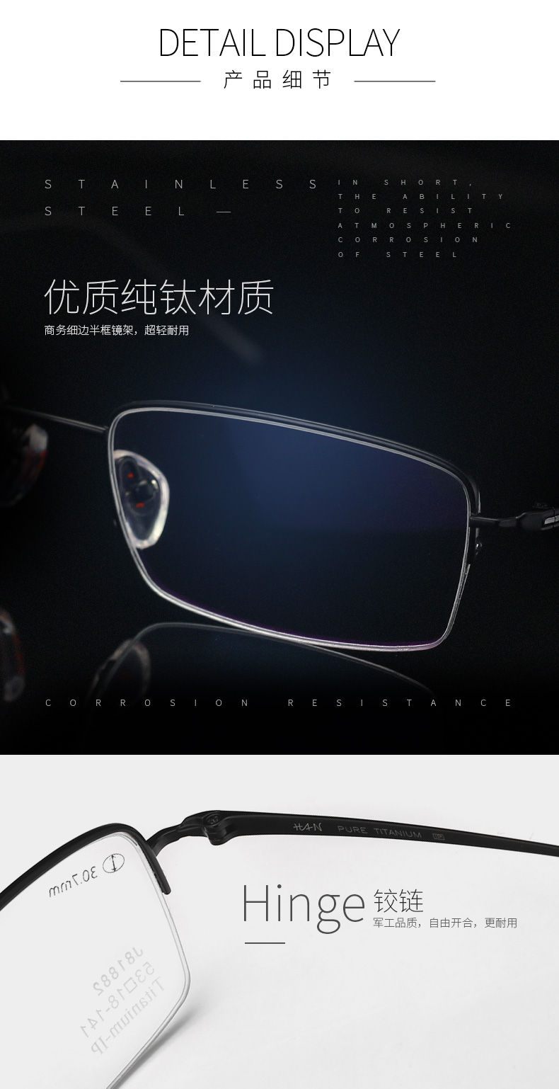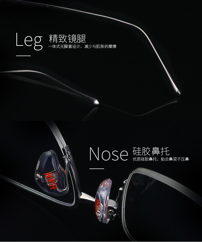 经典商务镜框,镜架材质为纯钛材质,耐腐蚀不生锈,不会引起皮肤过敏,眼镜仅重8克;舒适的外抛位弧形镜腿,保持着舒适的夹持力,减少头部压力;S型可调节鼻托杆,适合任何高度的鼻梁,镜腿处做了柔化处理,保证不摩擦皮肤。