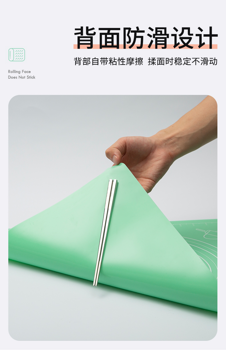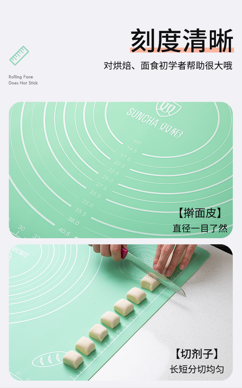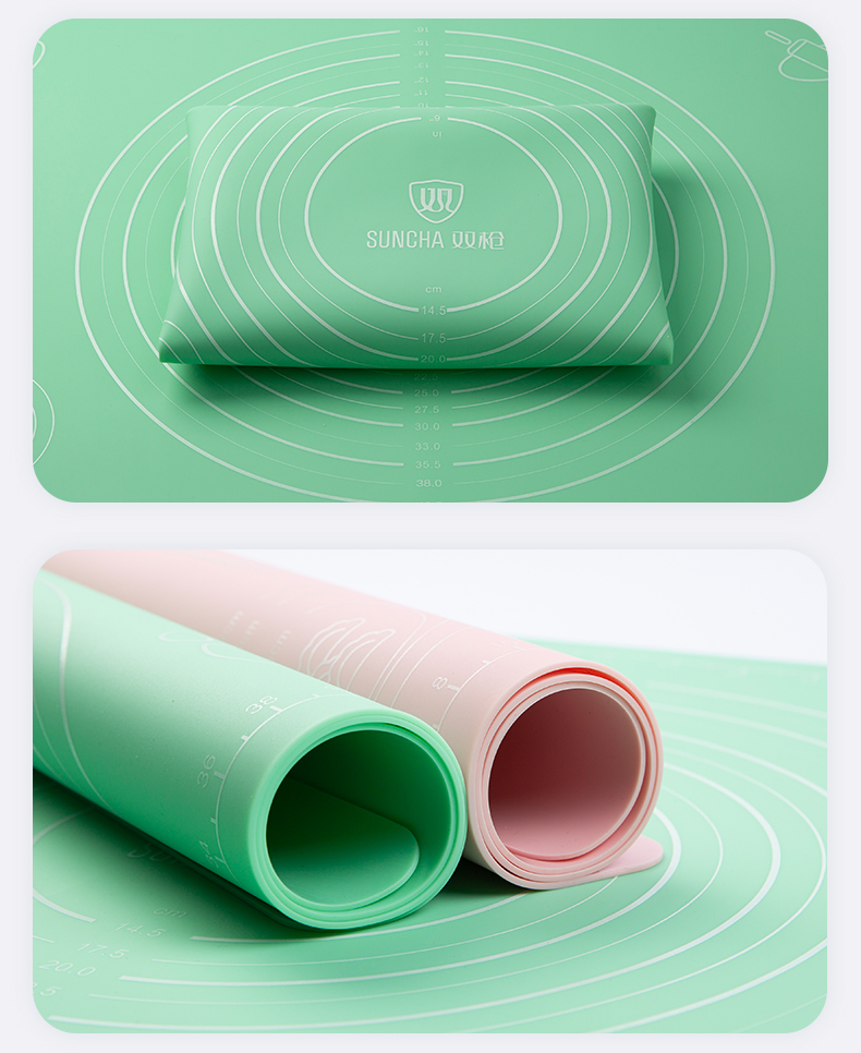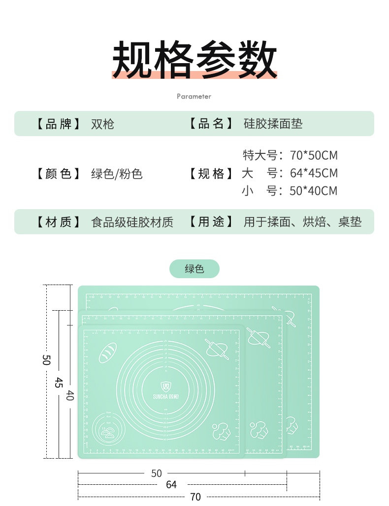 这类硅胶揉面垫网上非常多,价格也有高有底,质量更是良莠不齐,接触入口的东西一定不能贪便宜,这款是双枪的揉面垫,使用上市公司的原材料,加厚食品级硅胶,使用铂金硫化剂帮助硅胶成型,无任何刺鼻异味,符合国际权威检测标准,硅胶垫柔韧性强,耐久性也强,使用安全方便。