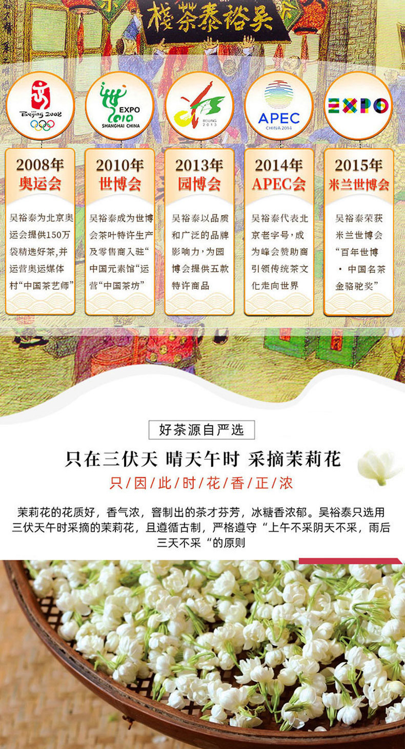 其中吴裕泰牌的茉莉牡丹绣球、茉莉雪针、莲峰翠芽等8个品种曾连续三年获国际名茶评比会金奖,并获日本、韩国评茶会名茶金奖。