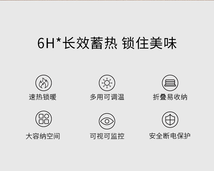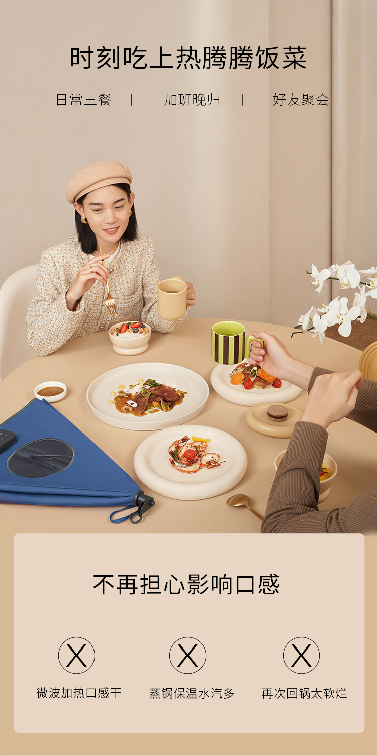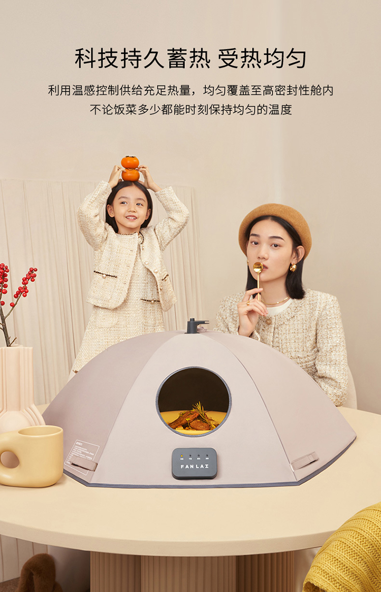 这款饭来保温饭菜罩 恒温加热保温热菜神器,利用温感控制供给充足热量,均匀覆盖至高密封性舱内,不论饭菜多少都能时刻保持均匀的温度;5层温控材质,锁温更高效,运用Heat Sense智能算法控制,能够精准控温,监测到达时间或温点自动断电,保护用电安全;6小时长效保温,揭开即吃;可容高汤碗,容量大小基本满足市面餐具形态;温馨暖光灯结合透明可视窗,饭菜状态随时看;2步折叠,易收纳不占地。