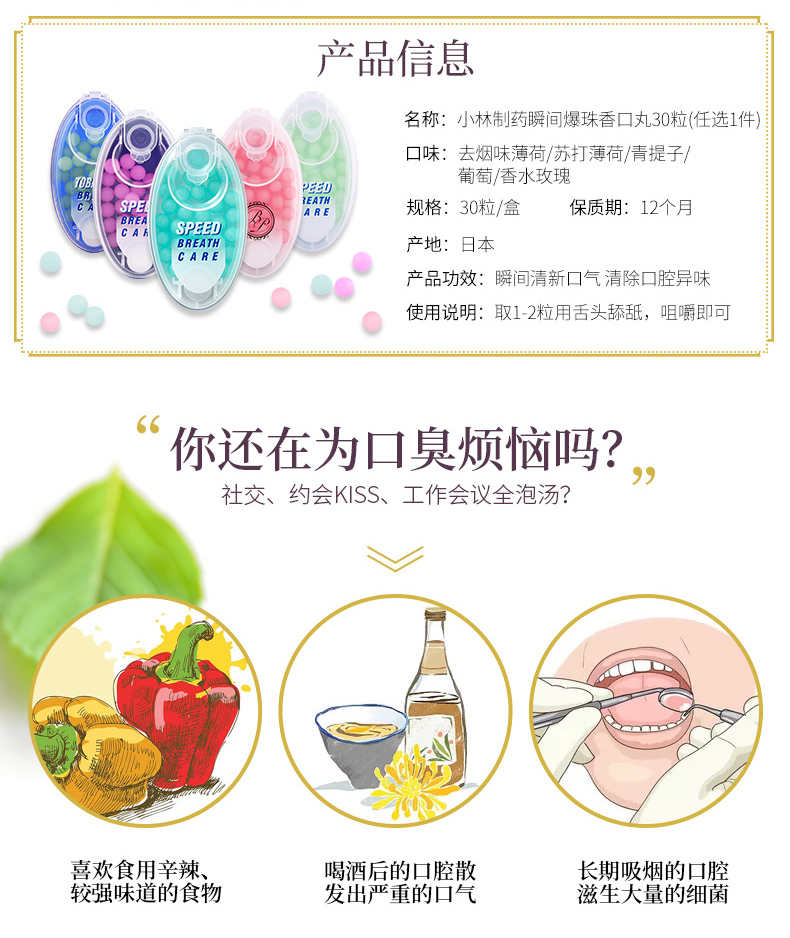 这款小林制药的爆珠清新丸与一般的口香糖、爽息丸均不同,这款是立竿见影,入口后能够瞬间清新口气,防止尴尬,苏打薄荷的清新,能持久释放清新口气,约会、开会以及抽烟后等情况均适用,便携包装。