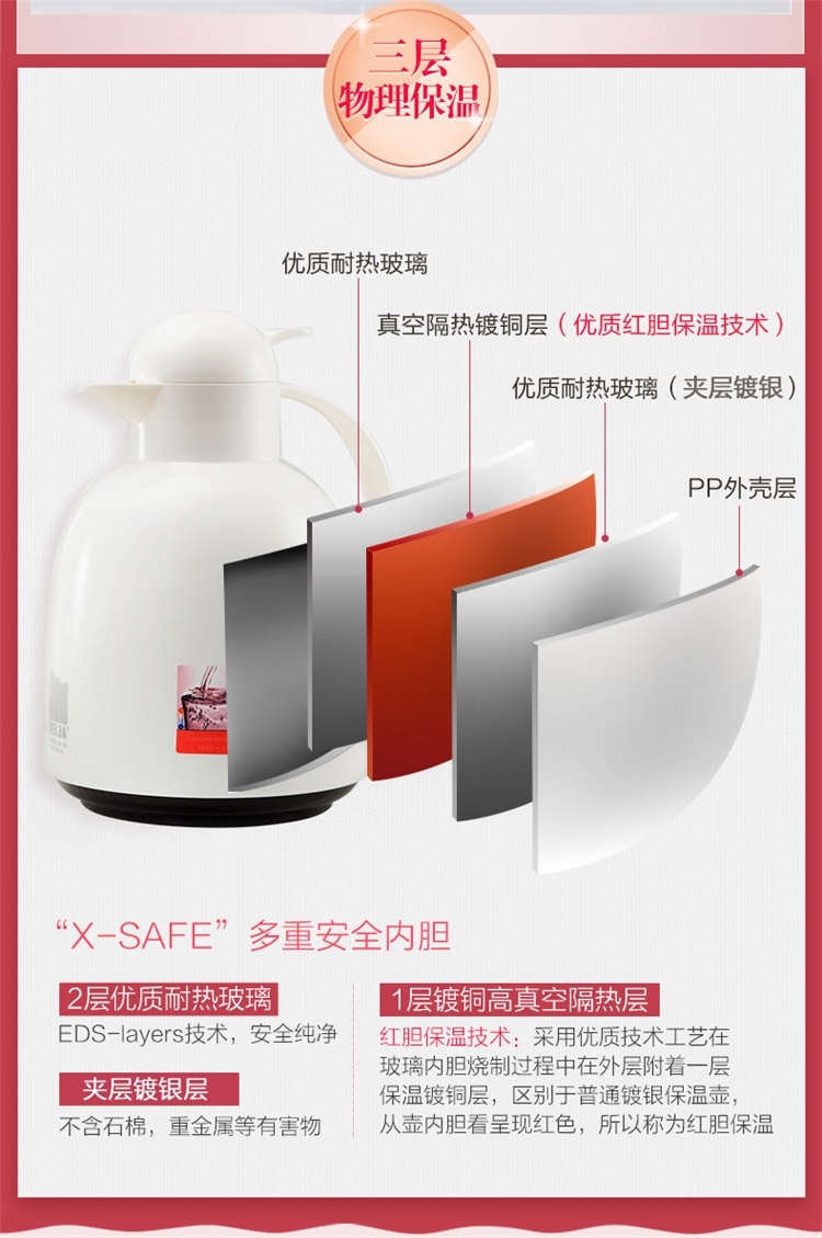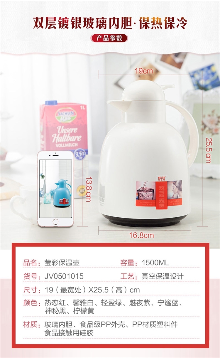 1.5L容量,大小刚好,进口红胆保温技术,高效保温,款式洋气,放在办公桌书桌上刚好。环保食品级PP外壳,食品级密封硅胶圈,玻璃双层正空内胆,三层物理锁温,中强效锁温,保热保冷。