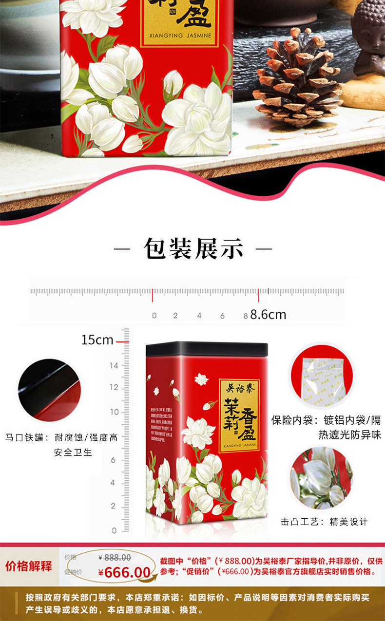 天猫吴裕泰官方旗舰店69元,下单立减6.9元,可领10元优惠券,实付52.1元到手,中华老字号吴裕泰,主营茶叶、茶制品、茶衍生品,以自拼茉莉花茶为主要特色,非遗技艺、六次窨制,其特点是:"香气鲜灵持久,滋味醇厚回甘,汤色清澈明亮,耐泡",被消费者亲切地称为"裕泰香"。