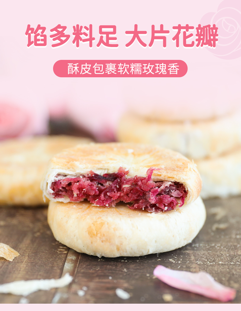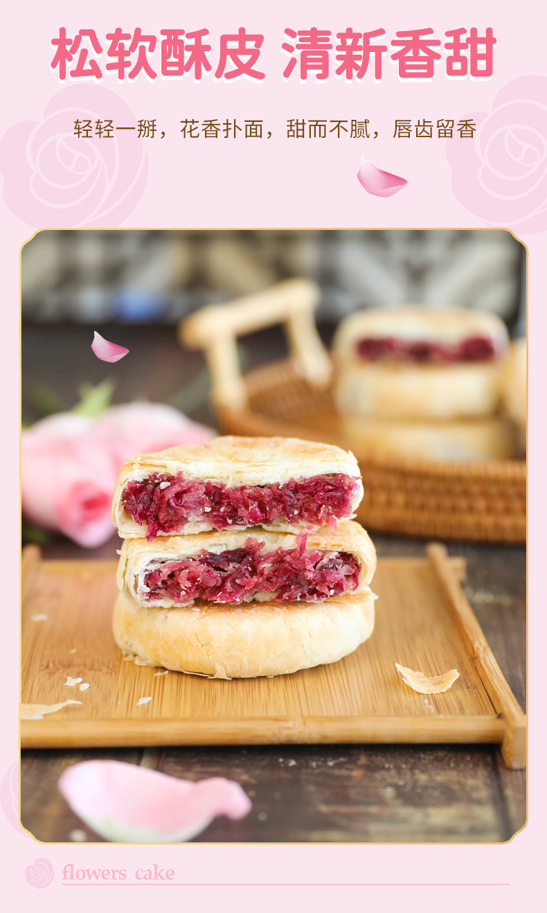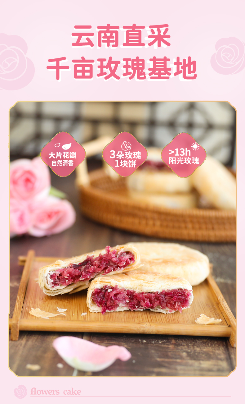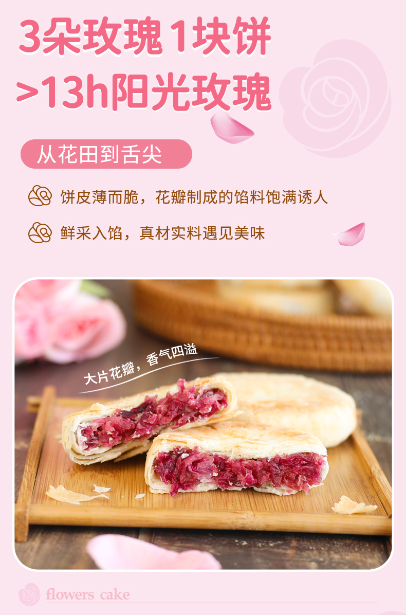 桃李大牌,手工玫瑰鲜花饼,云南基地直采,大于13小时的阳光玫瑰,3朵玫瑰1块饼,馅多料足,外皮层层起酥,清新香甜,花香扑面,好吃不腻!