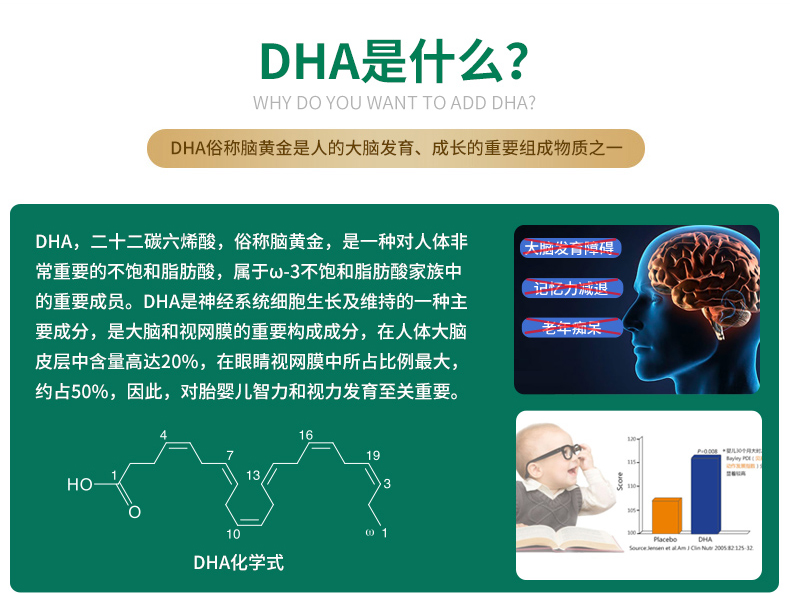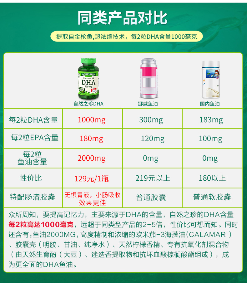 这款自然之珍 高效DHA软胶囊,提取自金枪鱼,超浓缩技术,每两粒DHA高达1000mg,EPA为180mg,比例值为5.5:1,OMEGA-3为1240mg,无惧胃液,小肠吸收,效果更佳。 增强大脑和神经系统活性,维持大脑功能,防止智力下降,EPA可以提高精力,帮助缓解压力,保持愉悦心情。