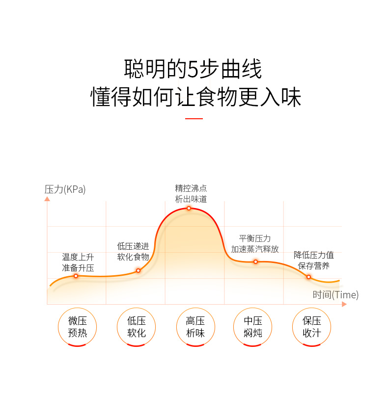 智能8段调压,10重安全防护,自动识别不同食材,释放不同压力进行蒸煮,锁住食材的美味;还有进度显示,烹饪过程,一目了然,还有开盖收汁和一键排气功能;