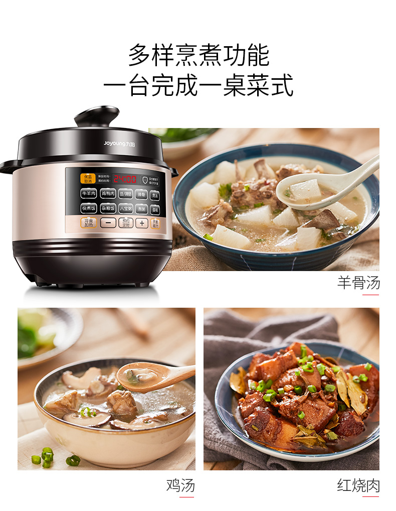 九阳的这款电压力锅,优雅黑和香槟金搭配,带有金属拉丝工艺,更加具有美感,很时尚。触屏大按键面板,有12大常用菜单,标准饭、煮粥、煲汤、排骨、鸡鸭肉、牛羊肉、豆蹄筋、八宝粥、蛋糕;