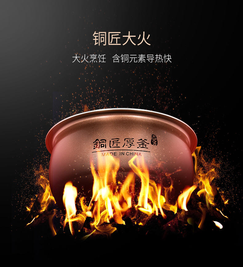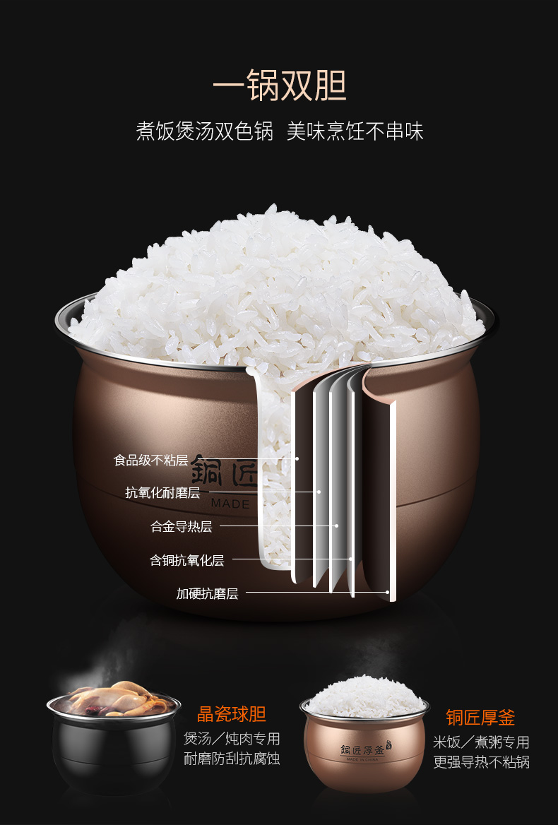 铜匠厚釜:选用导热性更快的铜匠厚内胆,食品级不粘涂层;可以粥饭、蛋糕;