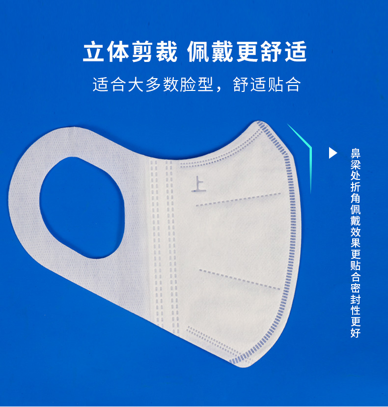 这款unifree 一次性3D立体口罩,外层无纺布,中间熔喷过滤布,内层无纺布,三层防护,过滤空气中的多种有害物质。立体剪裁,适合大多数脸型,舒适贴合,鼻梁处折角佩戴效果更贴合,密封性更好。无纺布耳带,透气,抗拉扯,佩戴舒适。