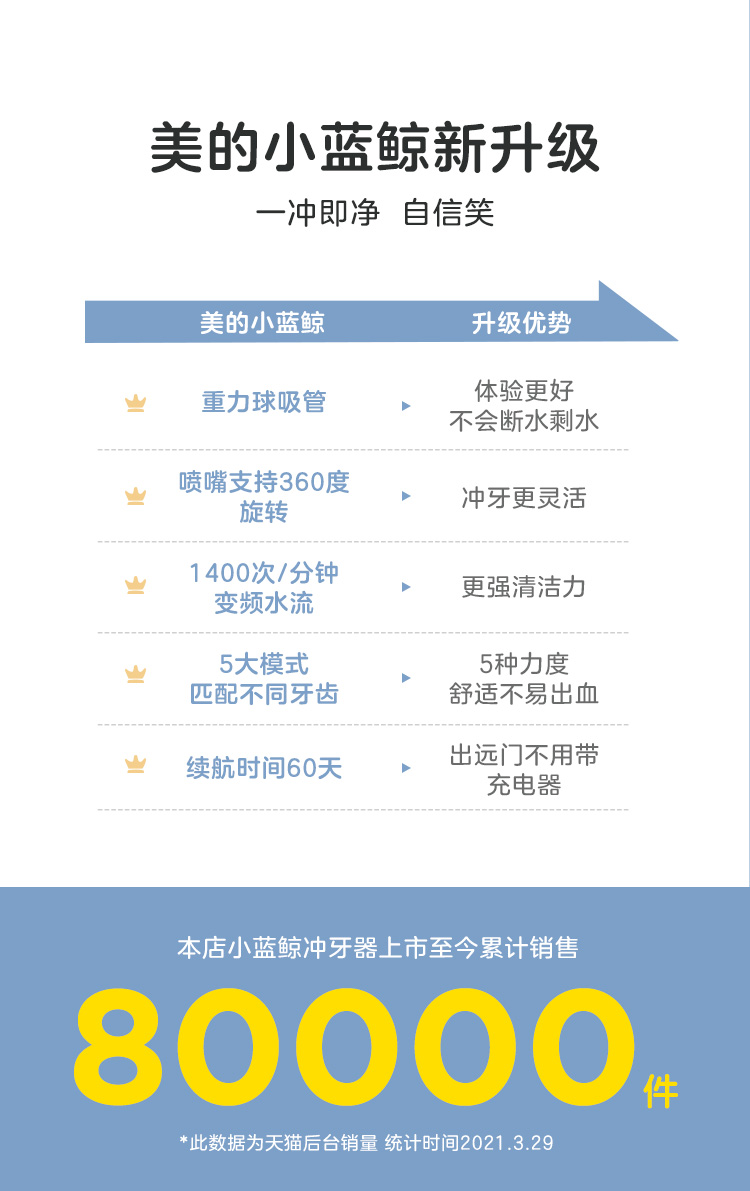 天猫美的口腔护理旗舰店269元,可领110元优惠券,实付159元到手,小降10元,送配件六件套护理包,强力水柱 无死角深层清洁牙缝 60天超长续航。