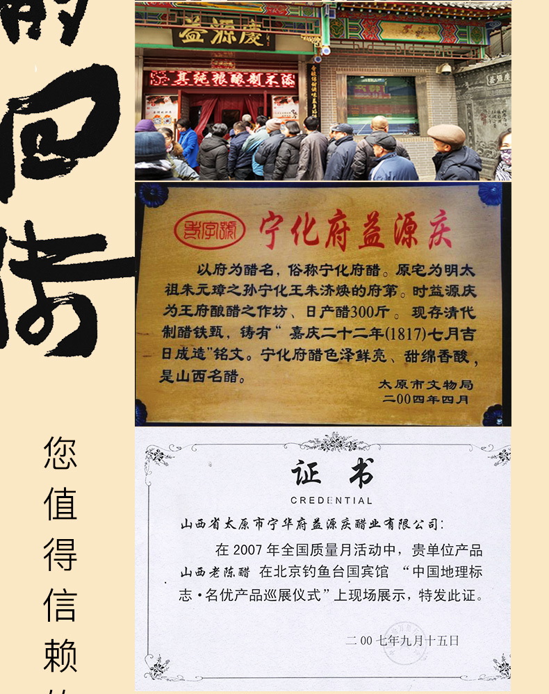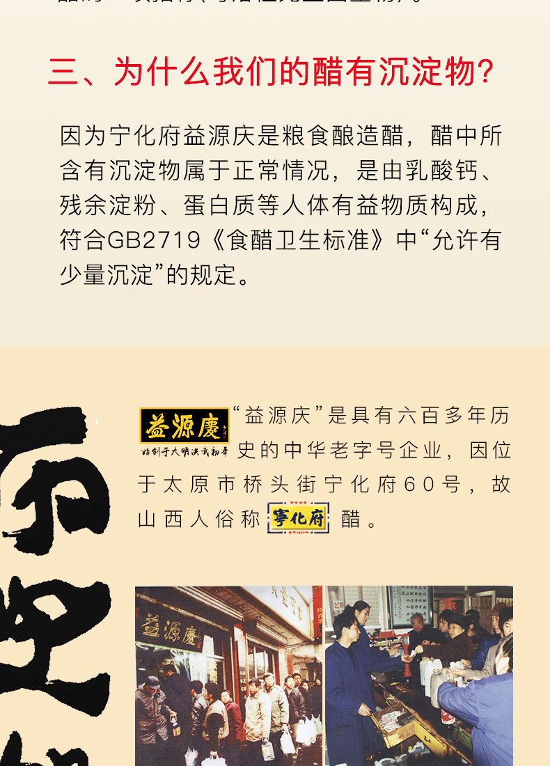 宁化府益源庆醋场,开业于清朝。开始以磨面为主,酿造醋、酒为辅。民国十年,太原增办了第二个面粉厂,益源庆经理李富恒就把经营重点转向以酿醋为主。他一方面聘请技术超群的师傅狠抓技术质量的提高,一方面研究精选原料,大力发展酿醋事业。数十年来,由于不断总结经验,始终不渝地坚持独特的操作技术并加强经营管理,所以,益源庆醋场生意兴隆,誉满全国。