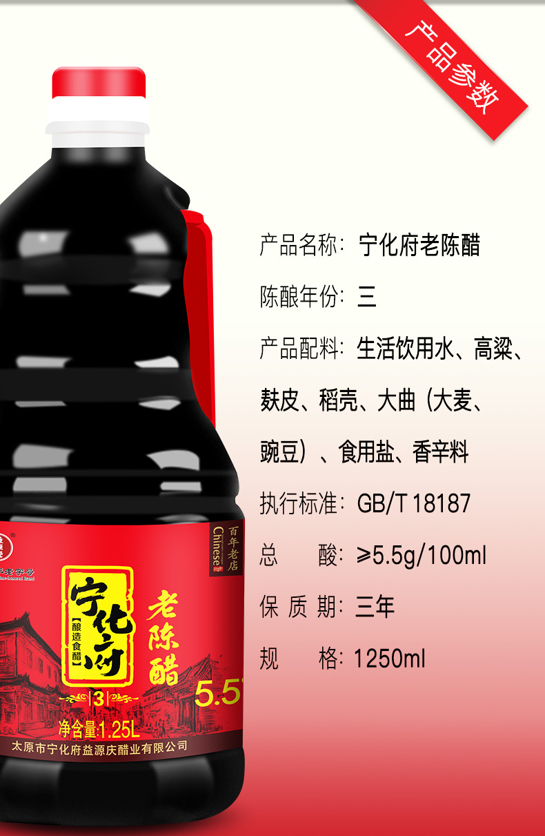 天猫益源庆旗舰店39.9元,可领3元优惠券,实付36.9元到手,买2送1,送同款,单件规格为1250ml,3年陈酿的5.5度陈醋,宁化府是国内最出名的老陈醋品牌之一。