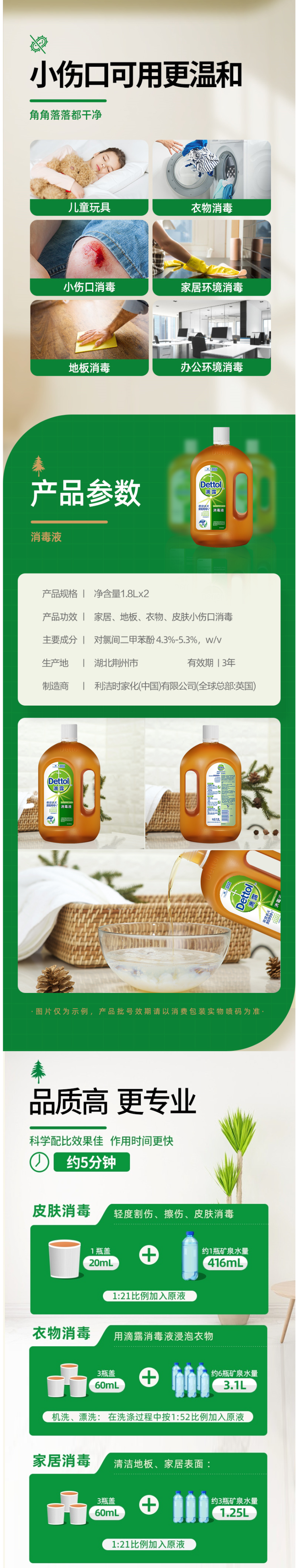 小编个人是比较喜欢滴露的,消毒液很有效,常备小瓶装用来伤口消毒,平常洗衣物的时候可倒20ml左右的消毒液放入洗衣机,能有效消毒。经常清扫卫生的家庭还可以在擦桌拖地时候使用稀释后的消毒液,家庭环境更清洁,尤其是家有小孩、老人、病弱患者等更需要。