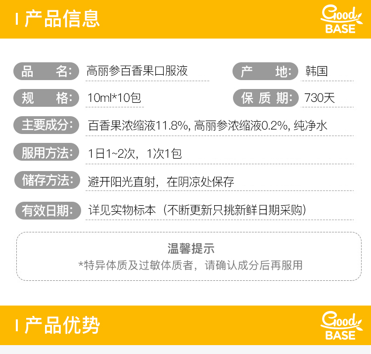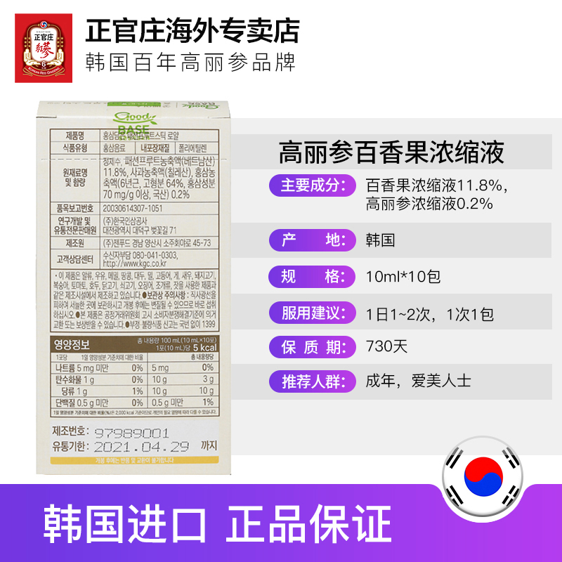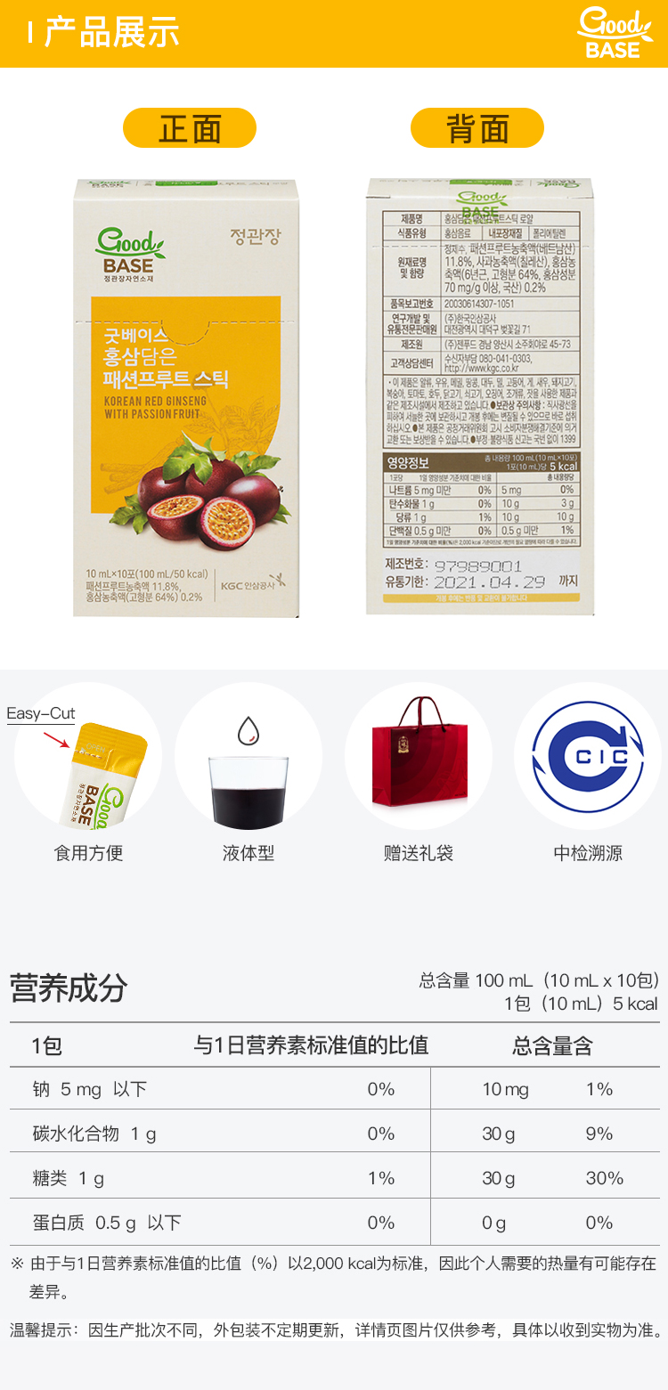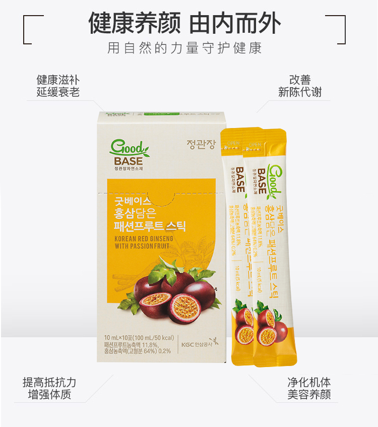 这款正官庄 红参百香果浓缩液,韩国原装进口,由百香果浓缩液 11.8%、高丽参浓缩液0.2%、纯净水为原料制成,能改善新陈代谢,提高抵抗力增强体质、净化机体美容养颜、滋补健康延缓衰老。