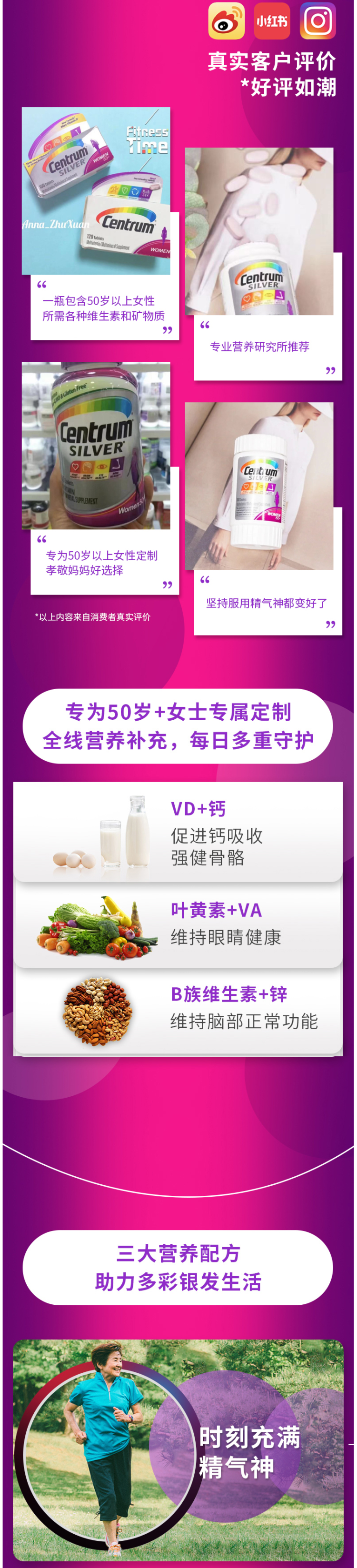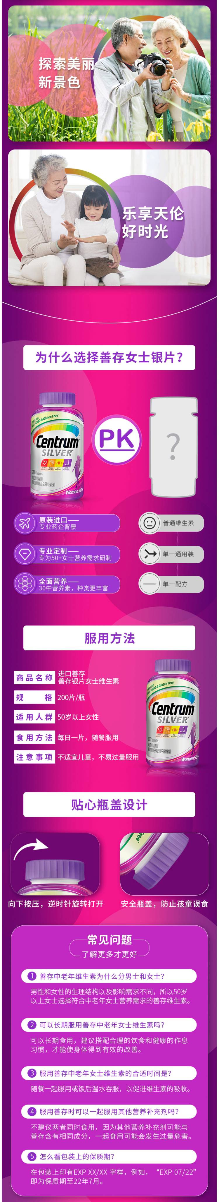 善存银片,美国原瓶进口,专为50岁以上中老年女士制定,复合13种维生、叶黄素、16种矿物质,富含钙、镁、硒等营养元素,加强了老年人所需的抗氧化营养素,有助增强免疫力,维护心血管健康,保护大脑,适合眼睛容易疲劳干涩、易疲劳、体力下降,易焦虑人群。