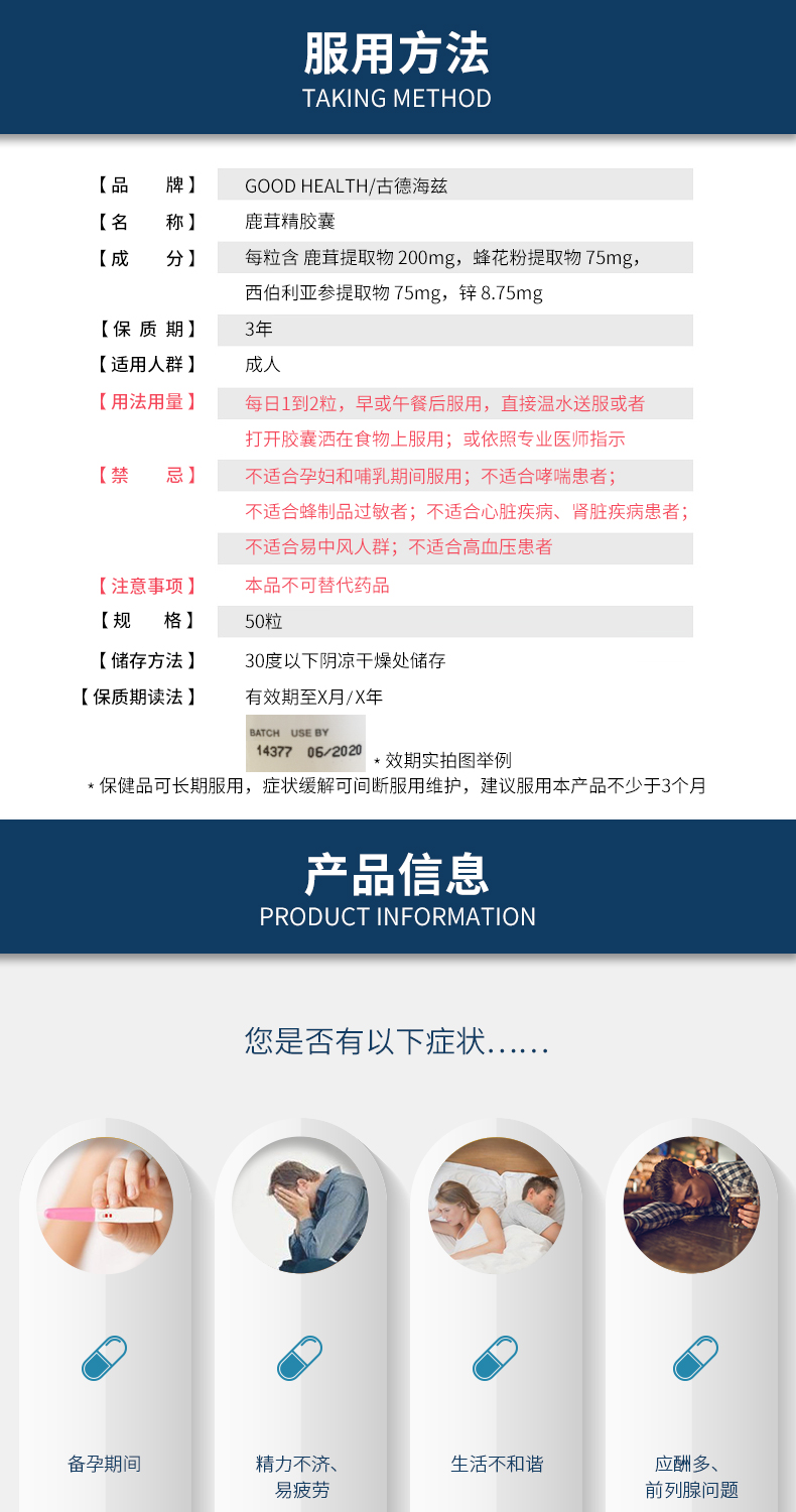 这款Good Health 鹿茸精胶囊,富含高质的鹿茸,人参,蜜蜂花粉以及锌元素,能提供全面补充并恢复男性的各项机能,提升生活质量,增进夫妻感情!