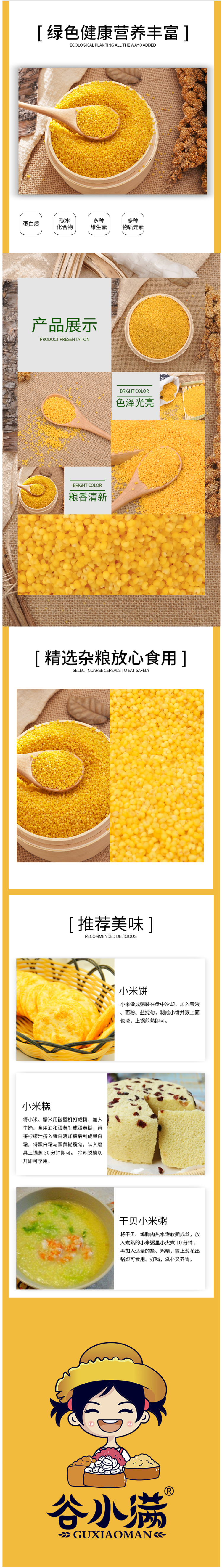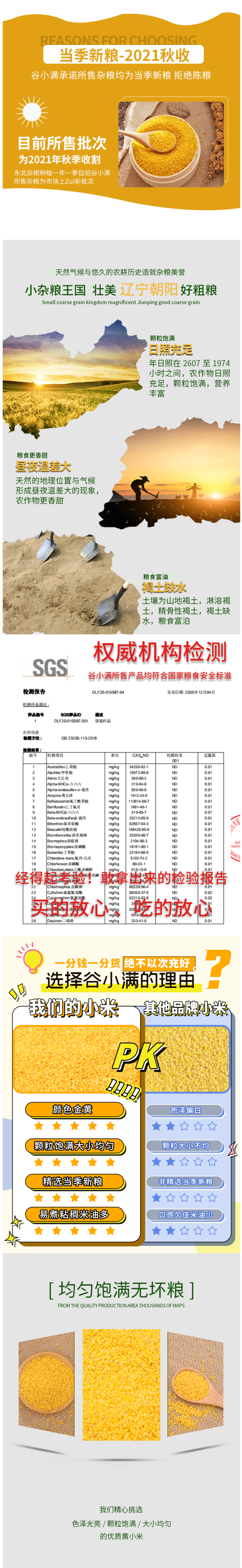 这款谷小满黄小米,是2021年的新米,色泽金黄,颗粒饱满,春种秋收,一年一季,人工种植收割,在种植过程中不使用农药、化肥、激素、除草剂、防腐剂等化学物质。
