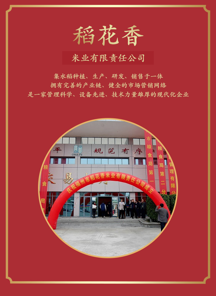 福州市稻花香米业有限责任公司,由福州市粮食局所属福州市米业公司、福州米厂与福建省粮油龙头企业福建省创世纪投资集团有限公司、鸿汇(福州)投资有限公司合作成立的国有控股的混合所有制经济实体。