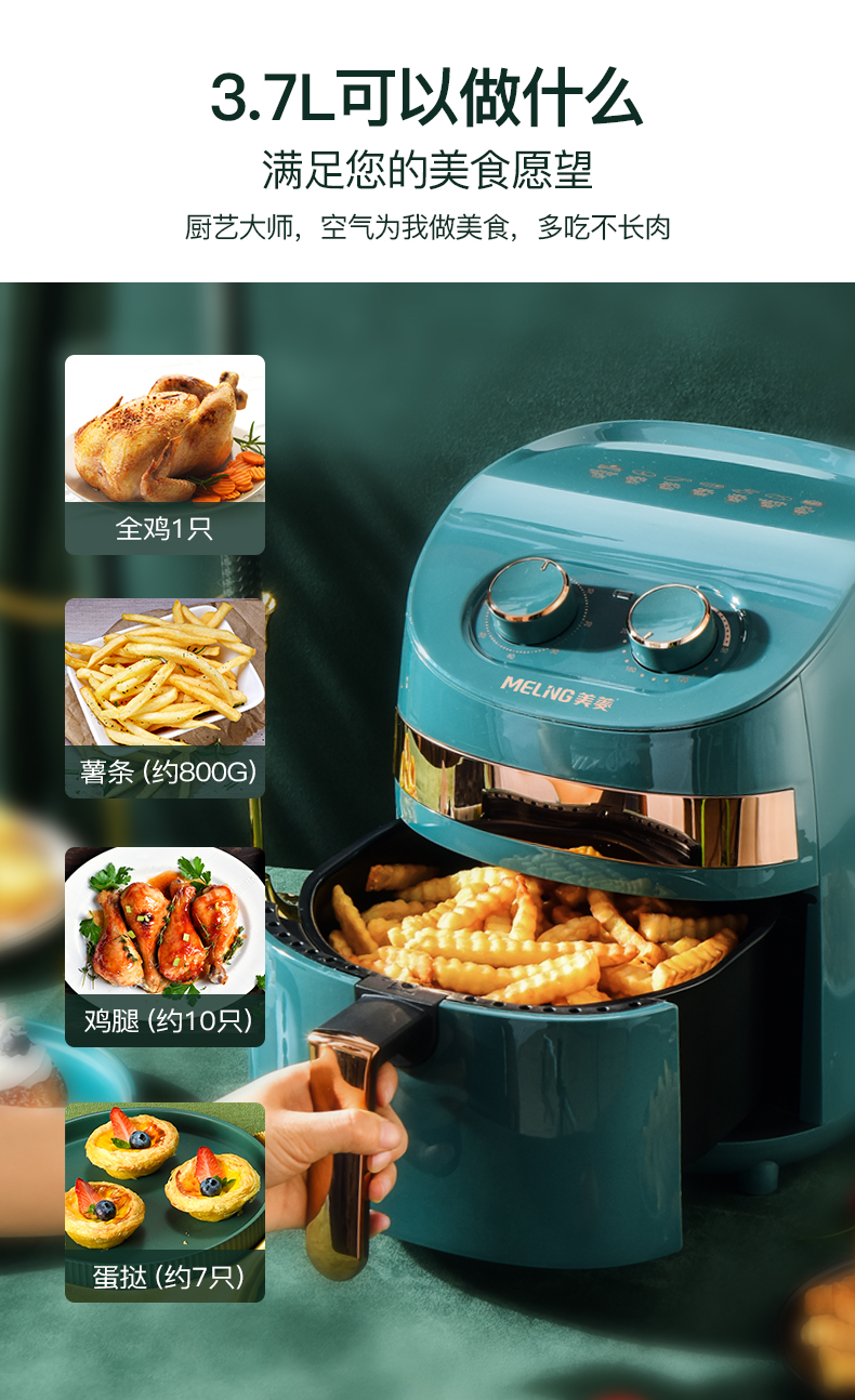 原理是通过空气循环加热锅内空气快速加热和脆化食物,代替传统油炸,过程中不加一滴油,还可逼出食物本身油脂,高温脱脂更健康。可用来制作薯条、鸡翅、大虾、排骨、肉串、地瓜、蛋挞等。