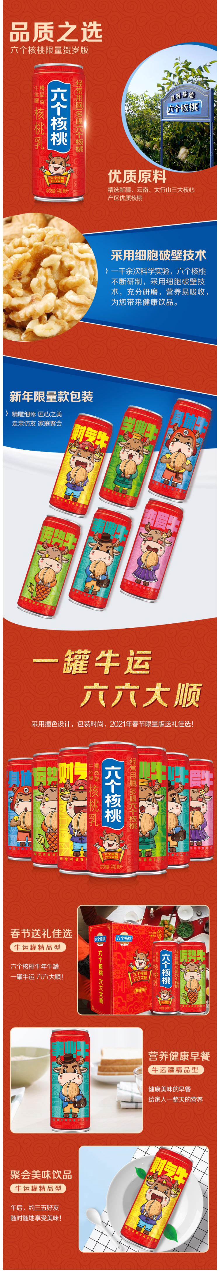 这款养元六个核桃植物蛋白饮料是牛年限量款,精选新疆、云南、太行山3大核心产区优质核桃,富含脂肪酸,增强脑力,纯核桃发酵,不含胆固醇。
