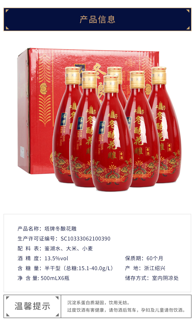 天猫塔牌酒类旗舰店89元,可领1元优惠券,实付79元到手,是正价358元的2.2折;这款正宗绍兴黄酒,精选鉴湖水、糯米、小麦等发酵酿造,纯手工酝酿散发着自然米香,口感微甜,醇厚柔和,酒精度13.5%vol,含有大量人体所需的氨基酸,有养身的功效,这款是半干型口味黄酒,总糖度在15.1-40.0g/L,规格:500ml*6瓶。
