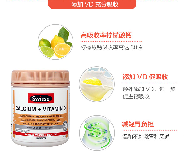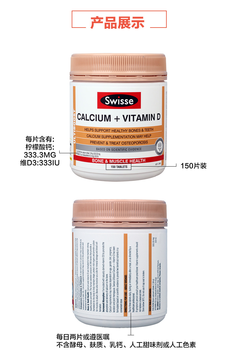 这款Swisse 维生素D柠檬酸钙片,澳洲进口, 可促进骨骼发育,预防骨质疏松,舒缓情绪,提高睡眠质量,缓解腰酸背痛和抽筋等症状;可预防和治疗高血压和心肌梗死。
