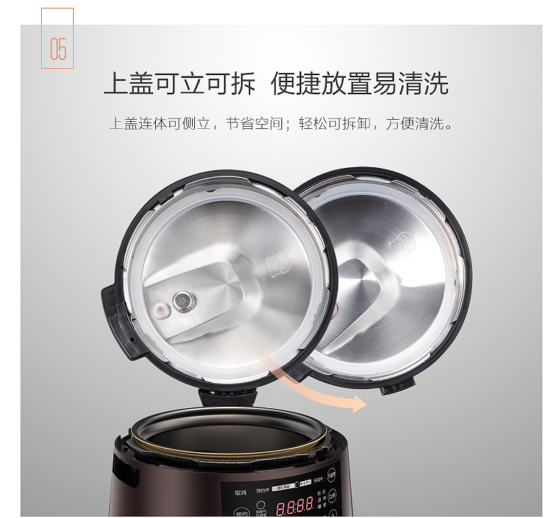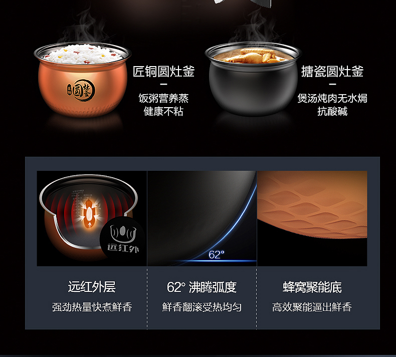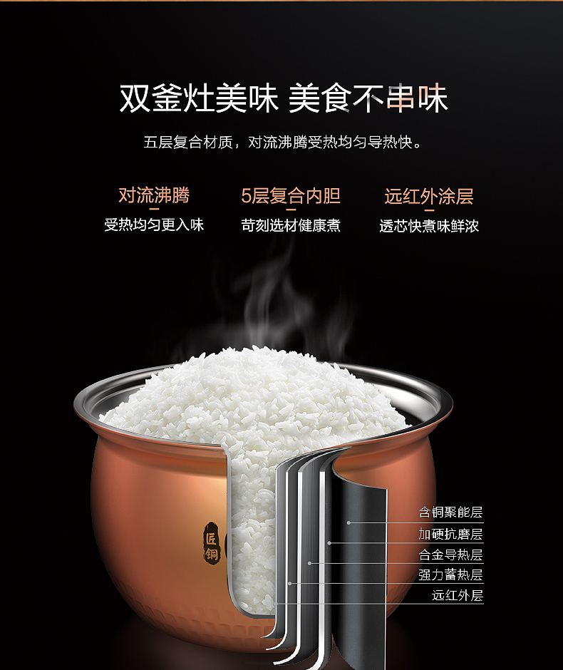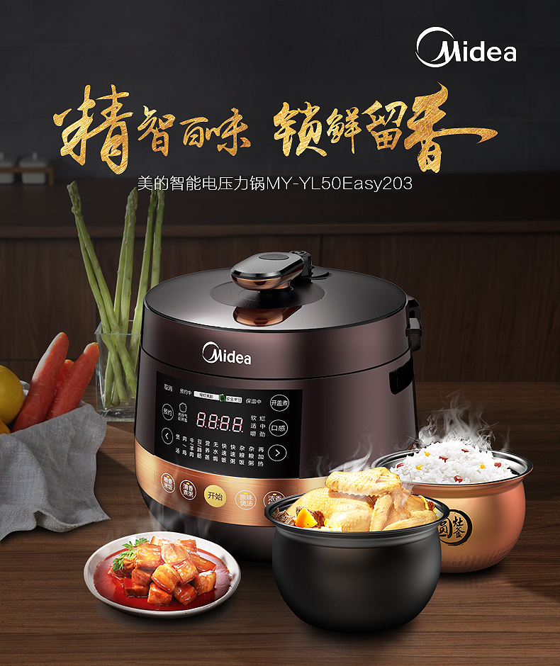 美的这款型号为MY-YL50Easy202的高压饭煲,随机身附带两个内胆,匠铜内胆用于蒸饭煮粥健康不粘,搪瓷内胆负责煲汤炖肉,无水焗抗酸碱。压力锅底部采用三角形控压,6万次耐压不变形,长时间更加可靠耐用。内置高灵敏探头,控温更精准。