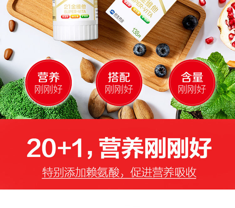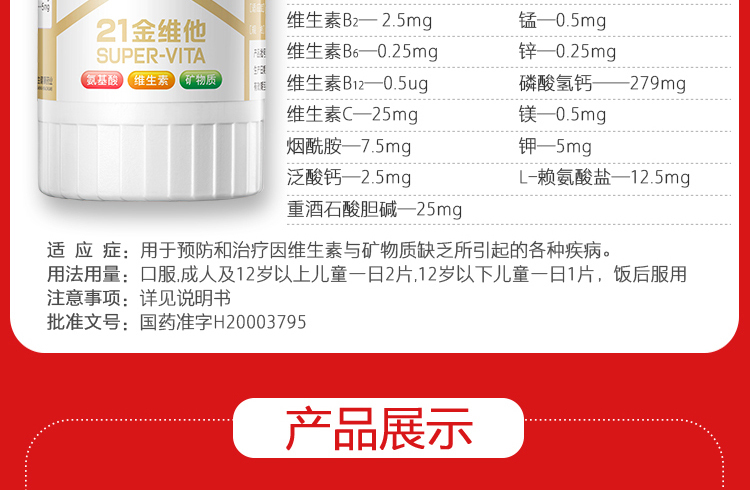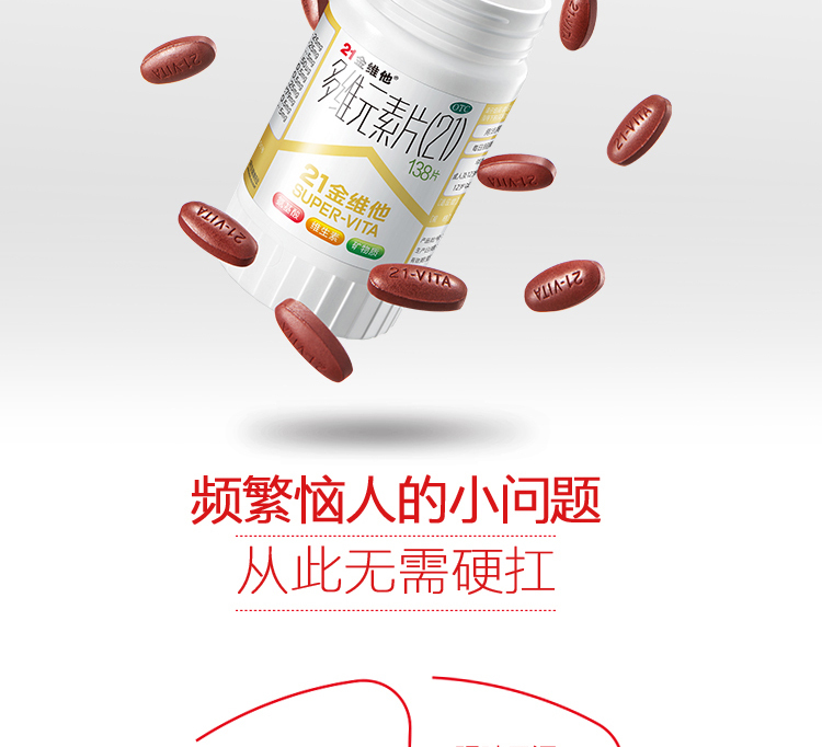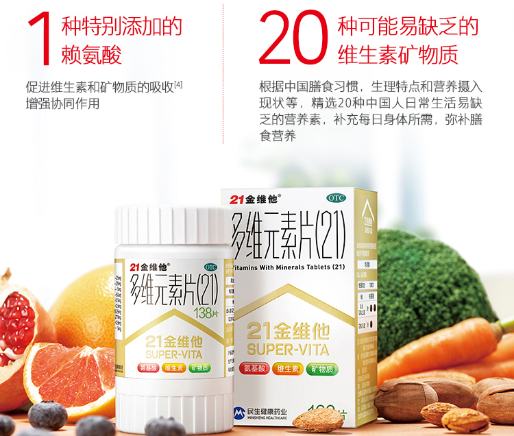 维生素和矿物质均为维持机体正常代谢和身体健康必不可少的重要物质,缺乏维生素可导致代谢障碍而引致多种疾病。这款21金维他 多种复合维元素片,包含赖氨酸和20种易缺乏的维生素矿物质,补充每日身体所需,