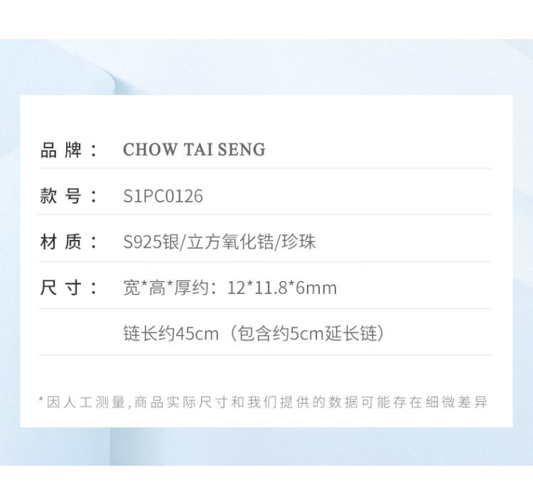 Chow Tai Seng 周大生 S925珍珠贝壳银项链 ,货号: S1PC0126-2,贝壳含球的设计,新颖别致;优选淡水珍珠,散发柔和光晕,自带温暖气息。S925银镀K金更加亲肤,满镶闪耀锆石,光彩夺目。 周大生品牌在北京王府井百货开设了大陆第一家品牌专柜。中国知名珠宝品牌,截至2019年三季度,公司在全国共拥有3787家门店,门店总数跃居全国珠宝连锁企业第一。