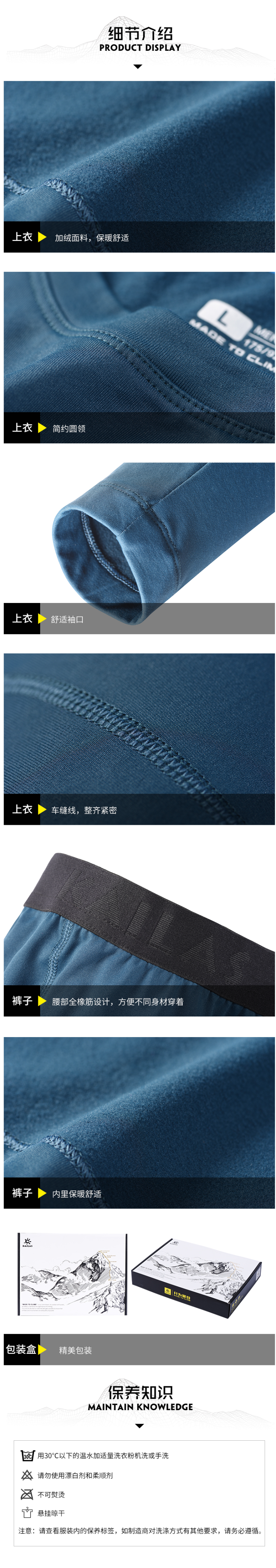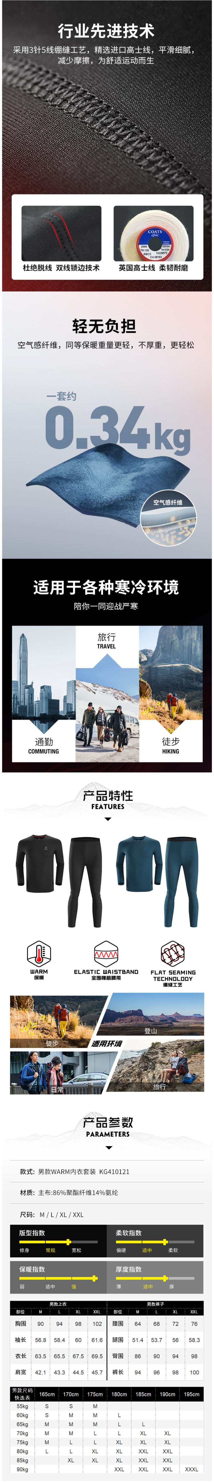 这款凯乐石 男 U-Warm加绒透气 保暖内衣套装,使用超轻空气感纤维面料/86%聚酯+14%氨纶弹,一套仅0.34kg,在同等的保暖效果下,这款的重量会更轻、不厚重,里层加绒,高效阻挡严寒,带来持久保暖。