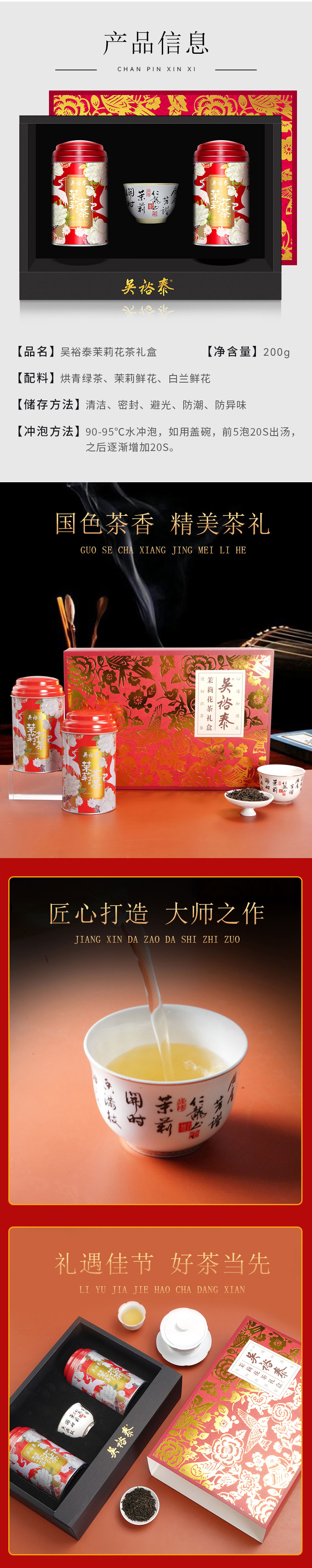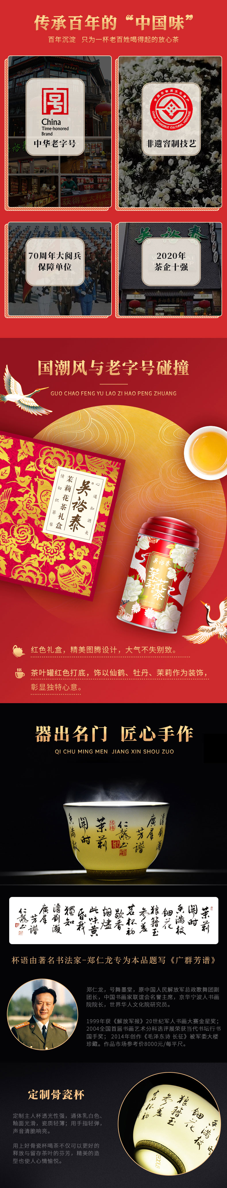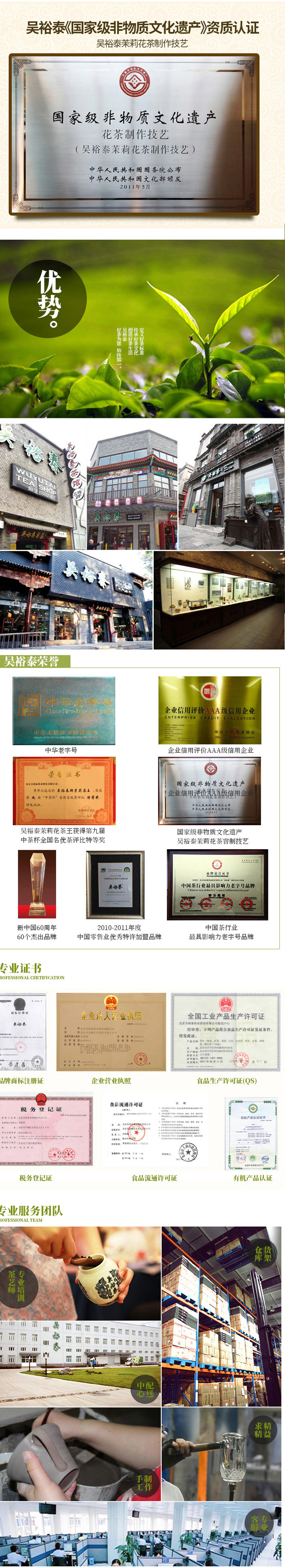 中华老字号吴裕泰,主营茶叶、茶制品、茶衍生品,以自拼茉莉花茶为主要特色,非遗技艺、六次窨制,其特点是:"香气鲜灵持久,滋味醇厚回甘,汤色清澈明亮,耐泡",被消费者亲切地称为"裕泰香"。