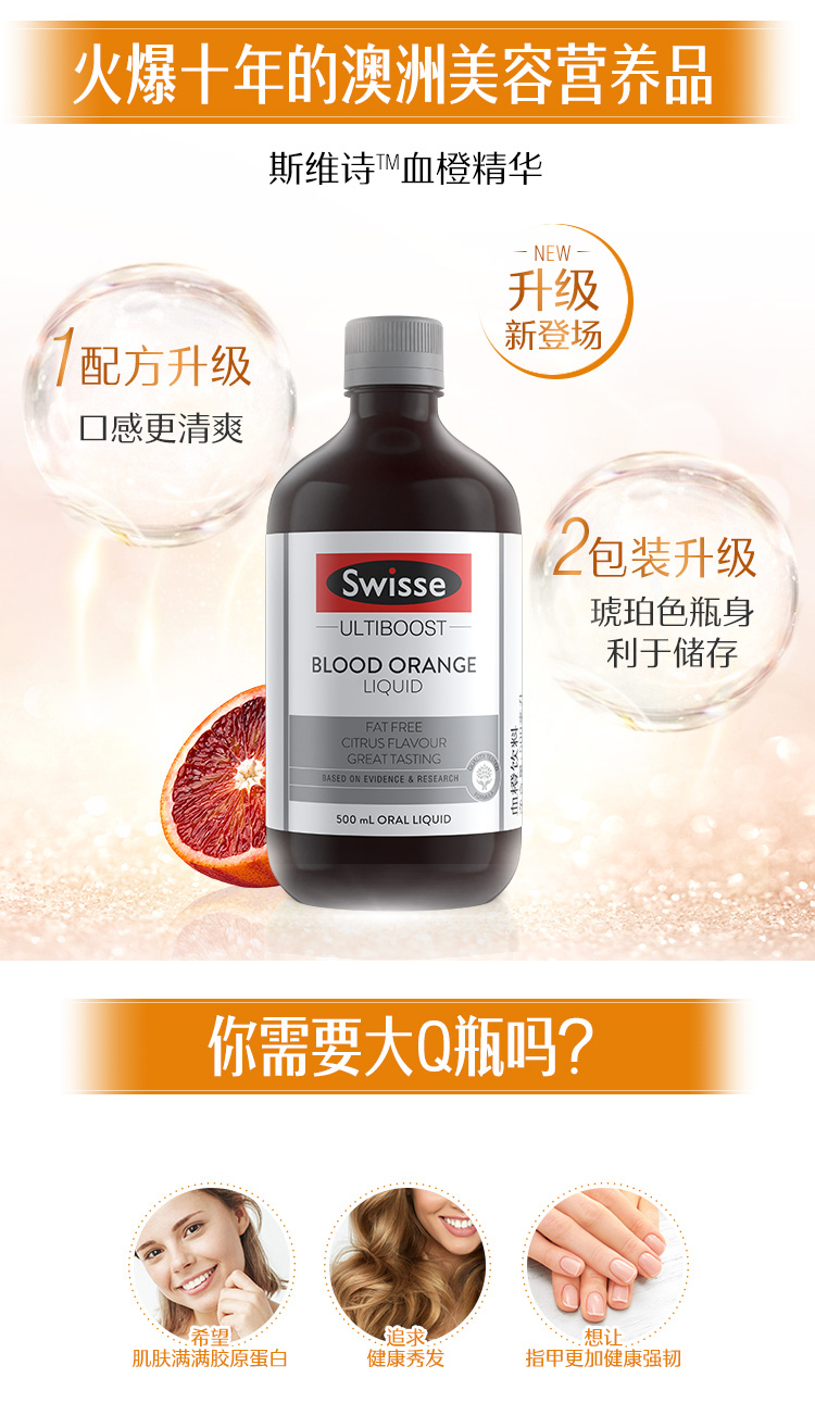 基于科学研究,采用口感上佳的优质配方,含天然血橙提取精华,二氧化硅、维生素C。促进胶原蛋白的生成,保障健康的头发、肌肤、和指甲,提供必要的营养。具有提高细胞活性,光鲜亮丽肌肤、秀发和坚固指甲的作用。