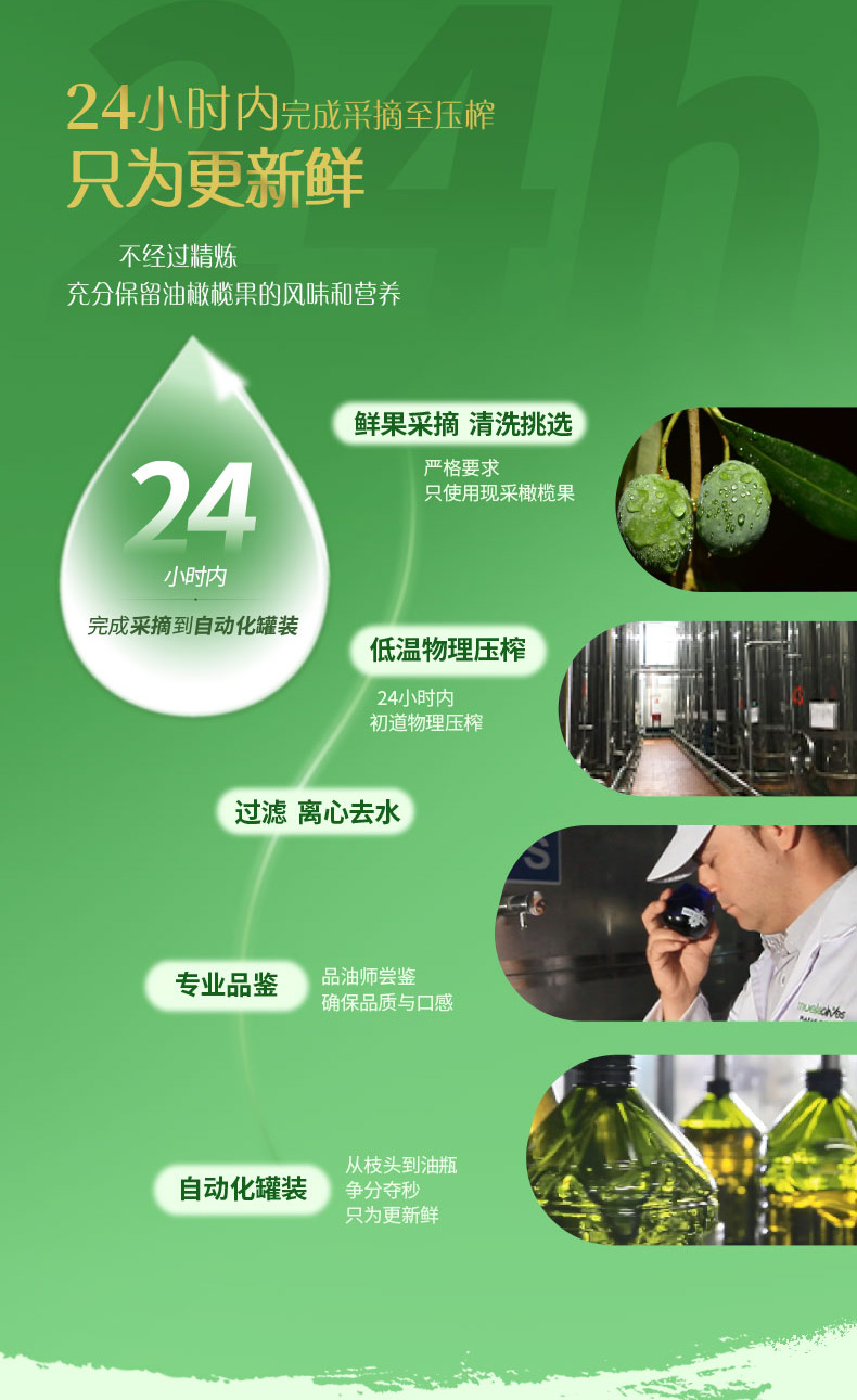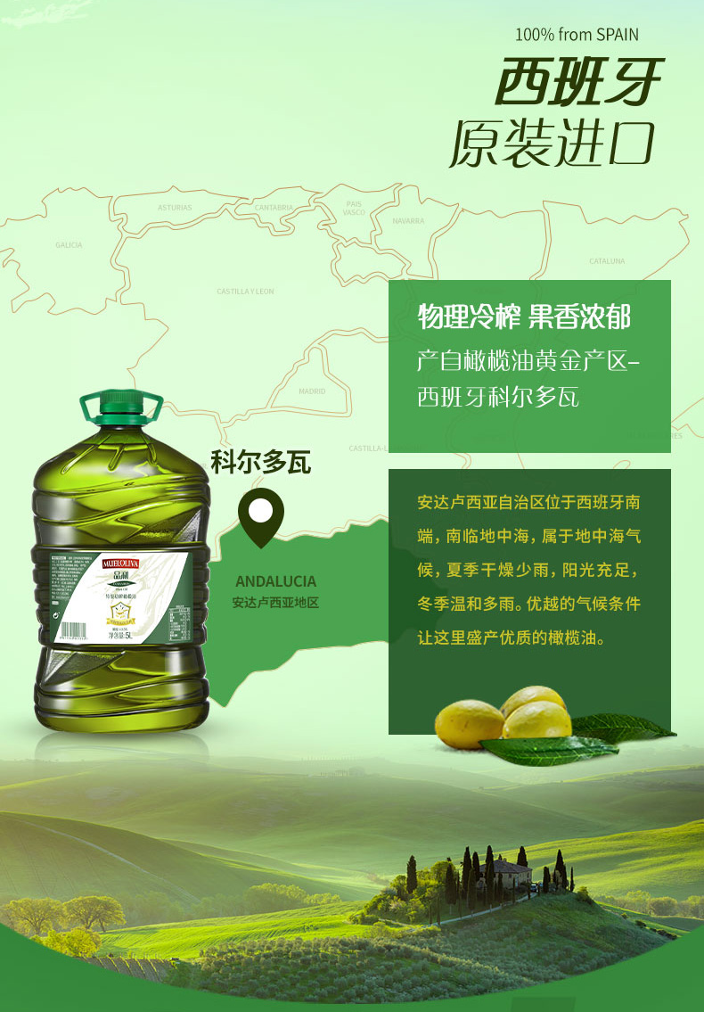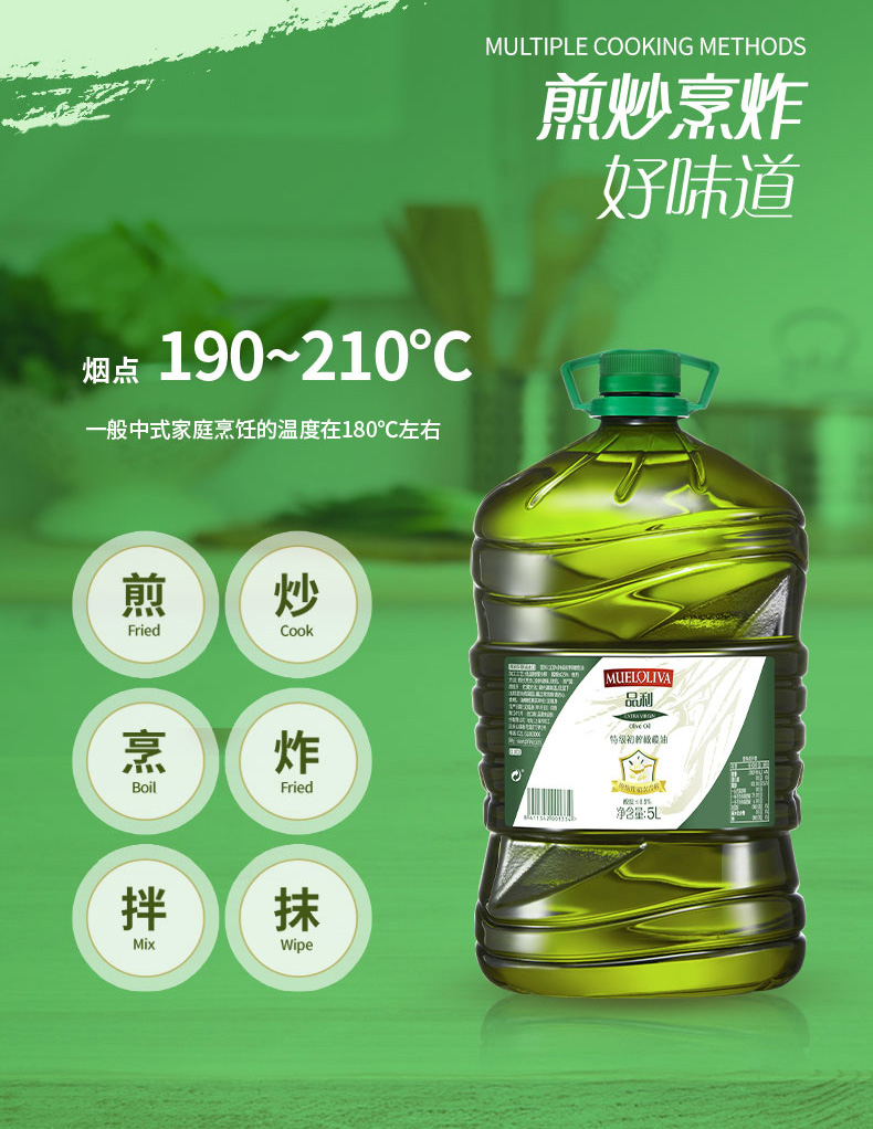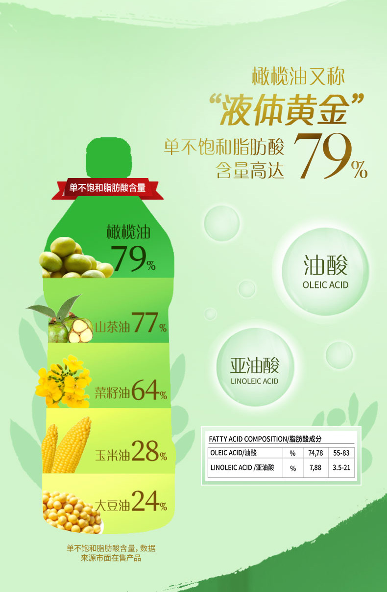 橄榄油是世界公认的高端食用油,主要原因是其单不饱和脂肪酸含量高达75%左右,为常见食用油中之最。初榨可以理解为头道油,此外初榨橄榄油一般都为冷榨工艺加工。