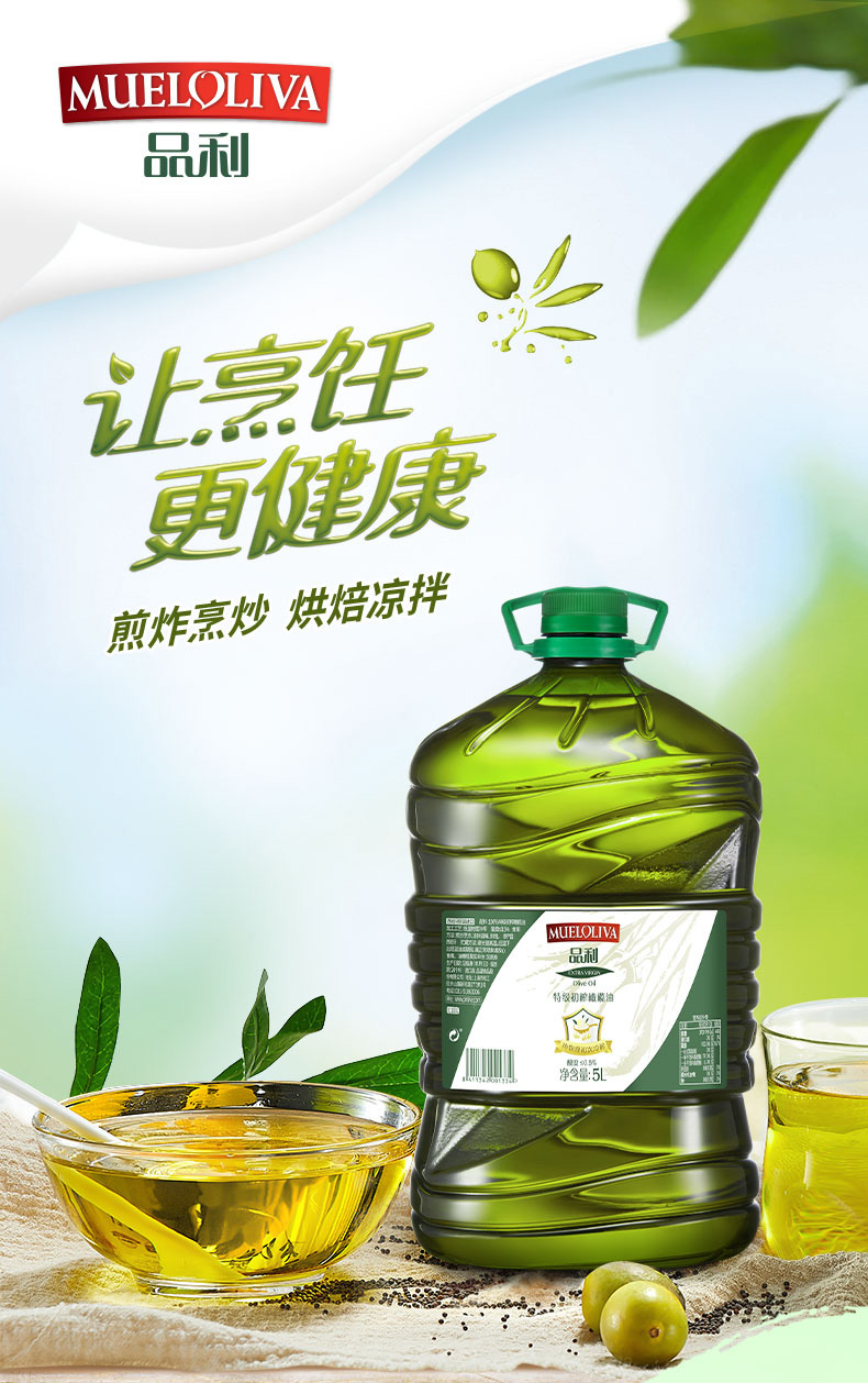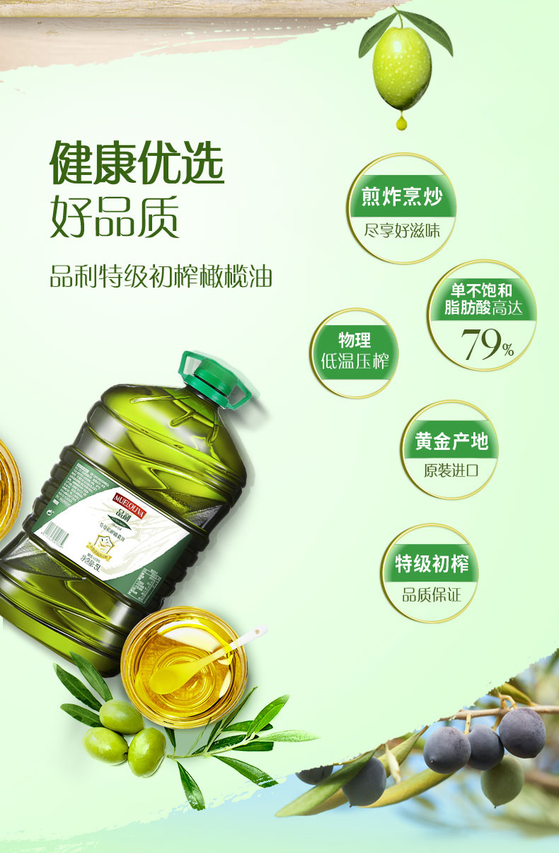 品利橄榄油采用地中海产区橄榄果为原料,采摘后24小时内冷榨而成,单不饱和脂肪酸含量79%。天然橄榄中的多配含量高达400ppm(毫克/千克),长期食用有利于人体健康。