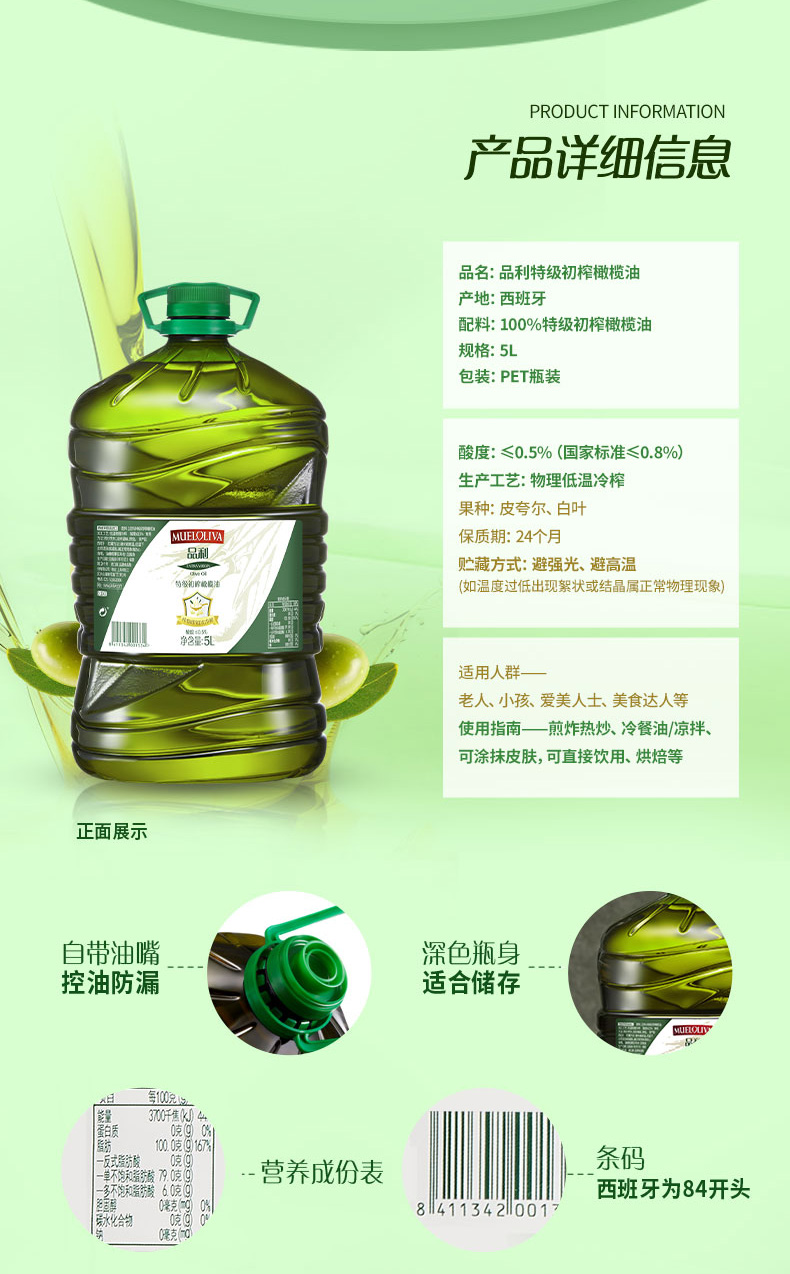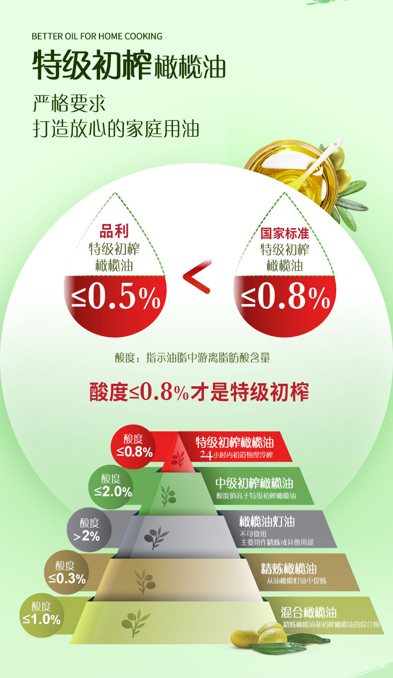 这款品利特级初榨橄榄油,西班牙原装进口,酸度≤0.5%。从酸度上来说,国际上普遍将最高等级的橄榄油(西班牙特级初榨橄榄油)的酸度定位在0.3%—0.8%之间,这个范围的橄榄油也被称作特级初榨橄榄油,酸度越低,品质越好。