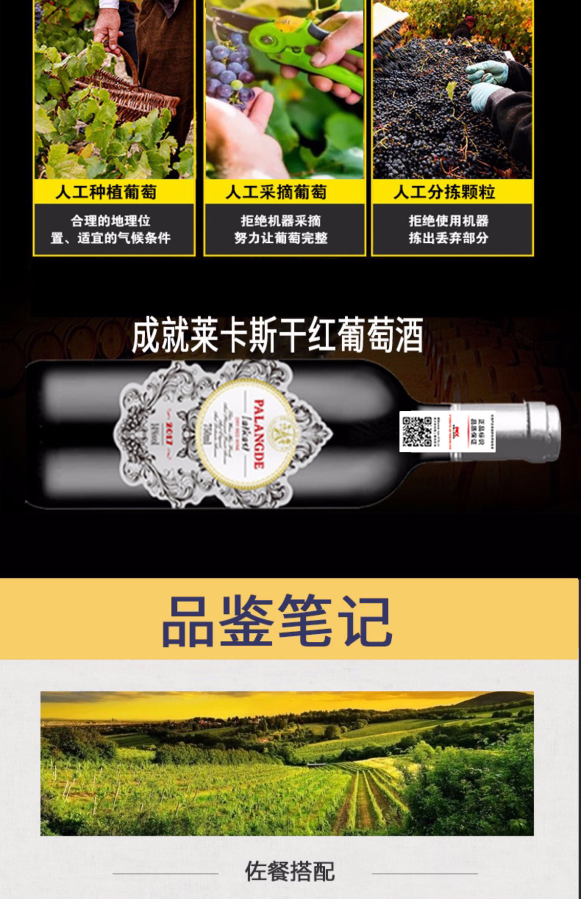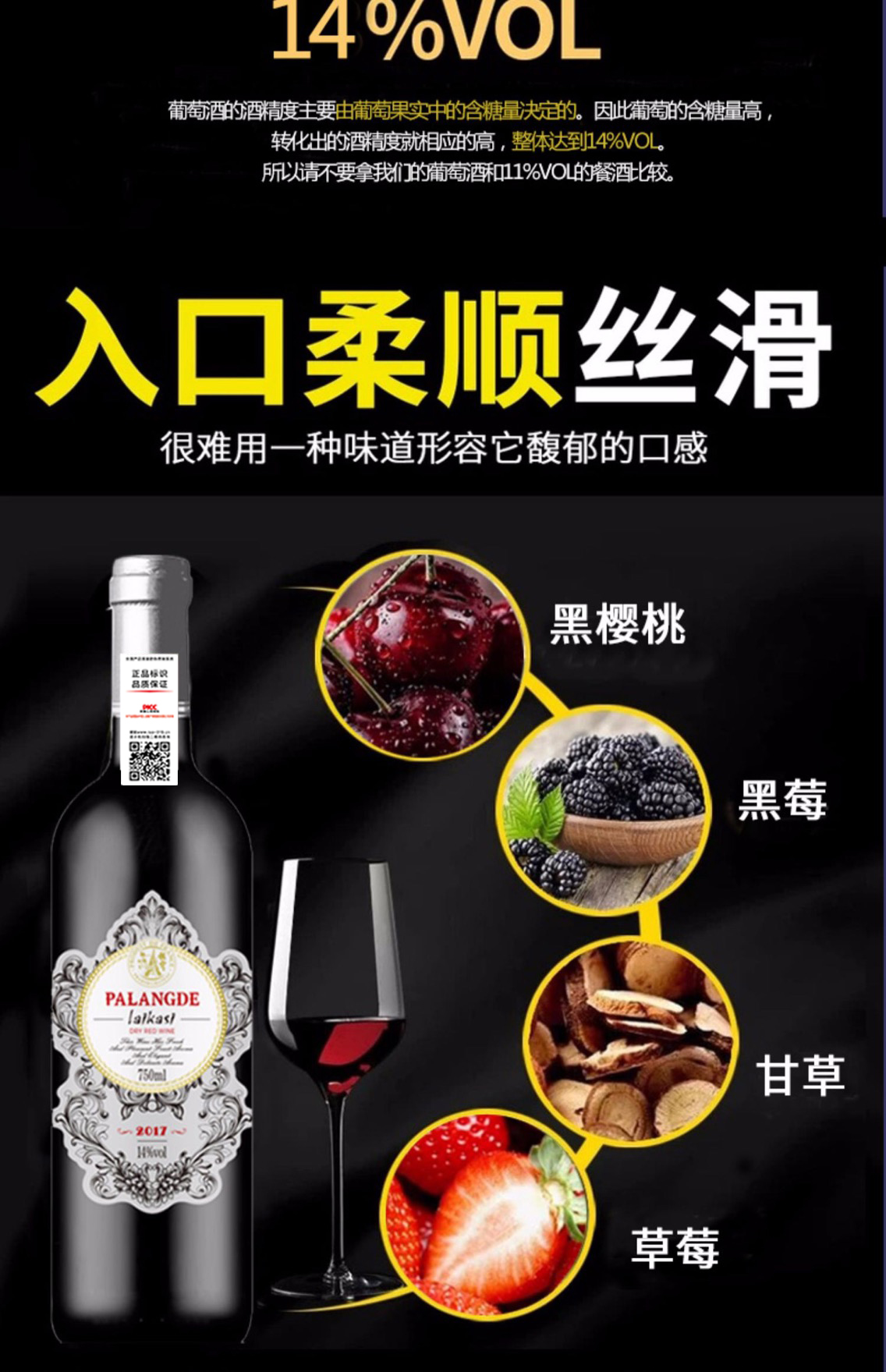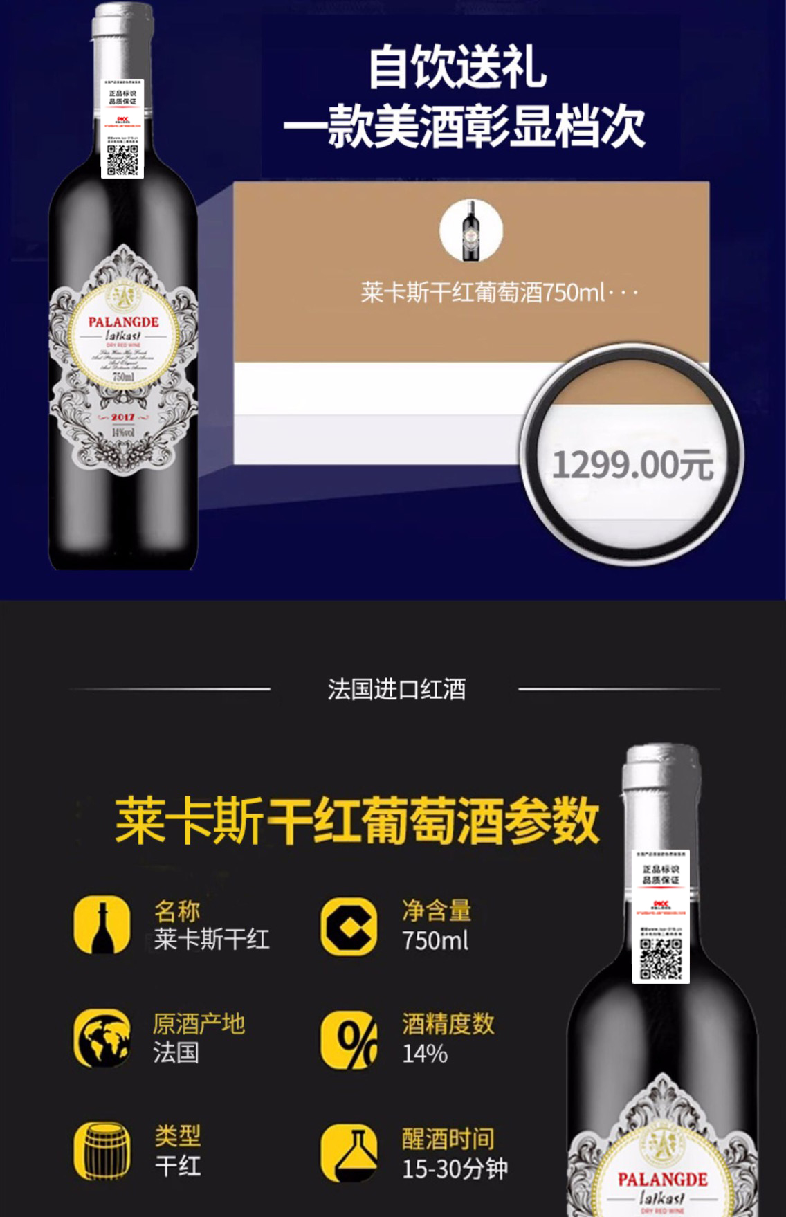 此款莱卡斯红葡萄酒,法国原酒进口,国内罐装,精选赤霞珠,采用法国传统工艺酿制,酒体呈明亮宝石红色,具有黑樱桃、黑莓、甘草、草莓的混合香气,口感柔顺,余韵清雅。规格:14度 750ml*2支装。
