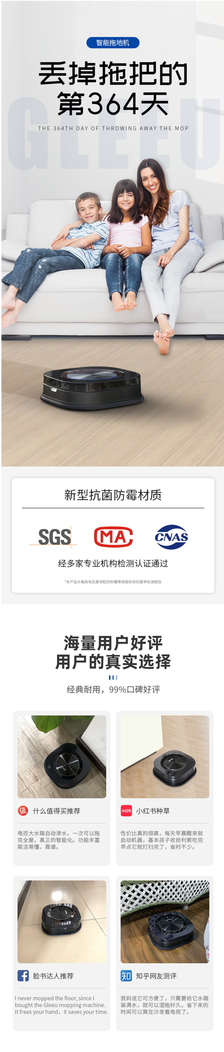 这款家有GMP310全自动拖地机,专门为拖地设计,能干湿两用,通过了SGS、MA、CNAS等多家专业机构的检测认证,可以放心安全购买。