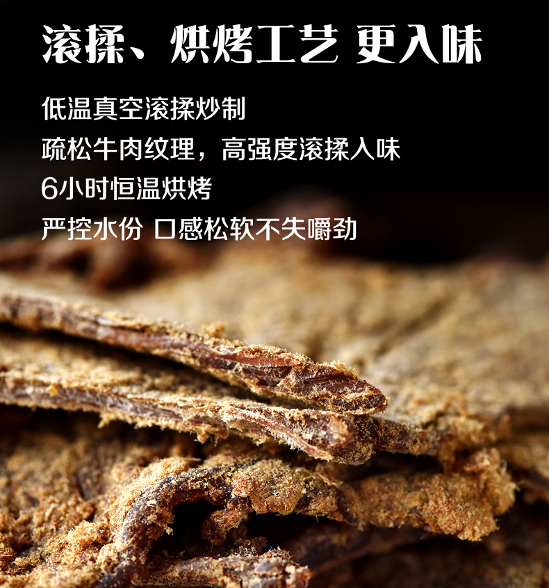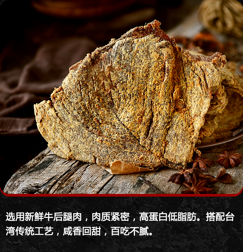 天猫牛大胜旗舰店37.8元,可领15元优惠券,实付22.8元到手,大片牛肉干,甄选自然放养黄牛的后腿肉,只取精华部位鲜嫩好肉,去肥去筋,真空滚揉工艺,6小时恒温烘烤,严控水分,口感松软不失嚼劲,8成烘干,2斤鲜肉出1斤牛肉干,台湾传统风味,咸香回甜,百吃不厌。