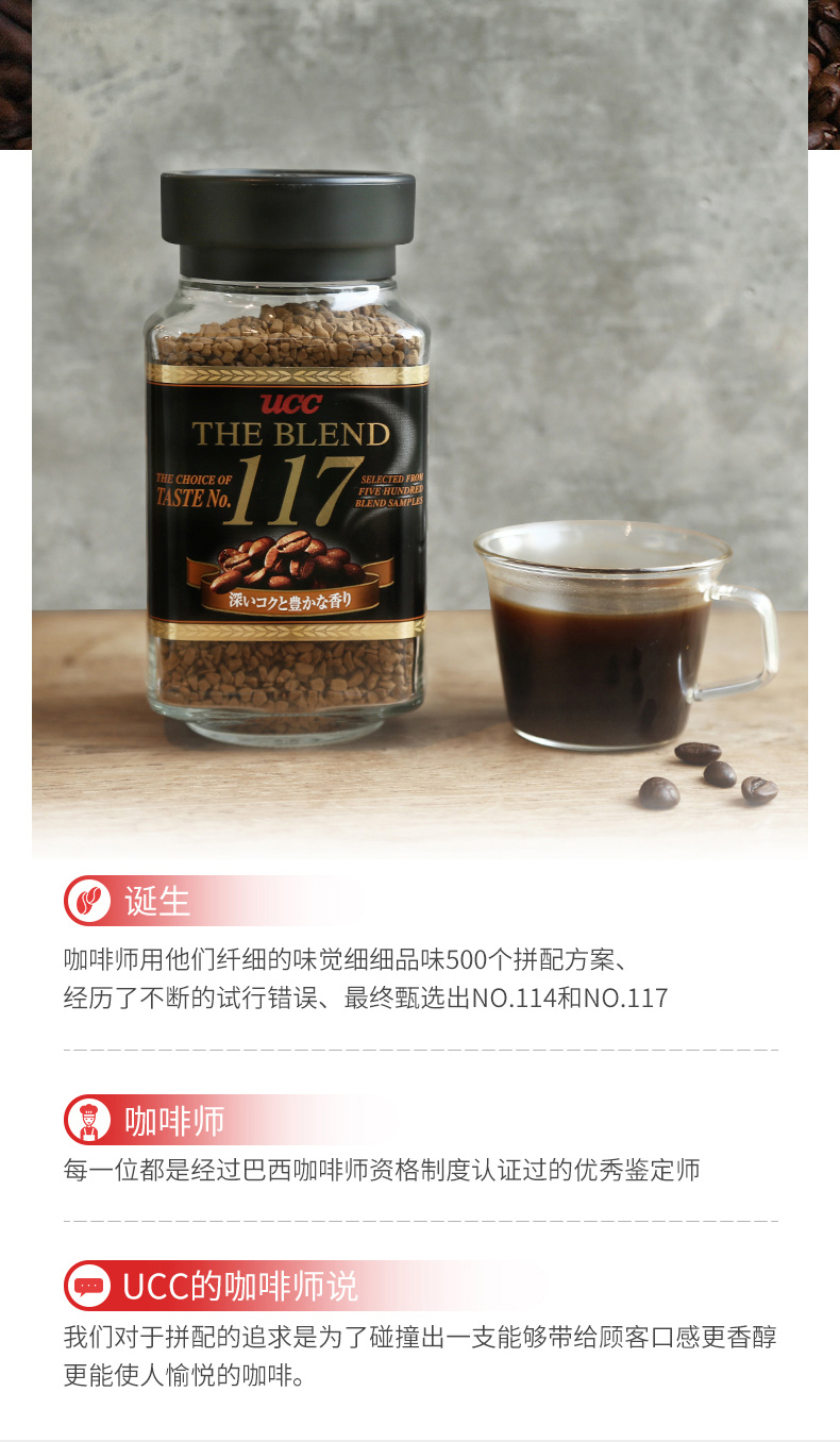 UCC咖啡是以定点精心培养、种植的咖啡豆为原料,由日本UCC上岛咖啡株式会社生产、销售的世界著名品牌咖啡。这款UCC(117)速溶咖啡90g,产地日本,从500多种口味测试中挑选出的浓醇口感,略微偏苦,比较适合口味较重的人群。
