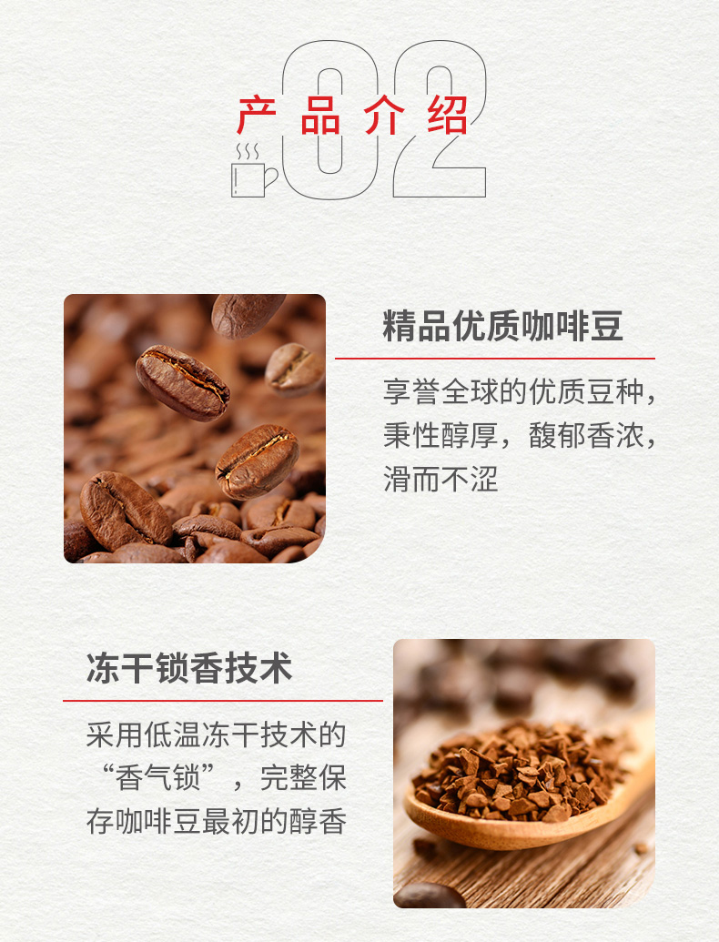精选阿拉卡比咖啡豆,经过慢火烘焙,平衡咖啡酸度,研磨至纳米级咖啡颗粒,充分萃取咖啡的醇厚香气,低温冻干而成。冲泡后香醇浓郁,爽滑顺口,黑咖啡本身具有减肥功效,不含糖分,热量极低,可以促进燃脂甩肉,男女通用,每天一杯,轻松享受好身材。