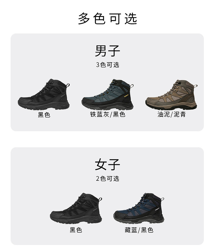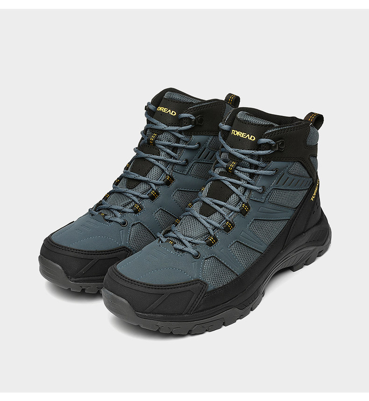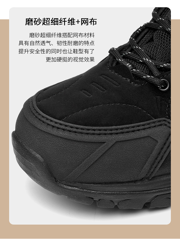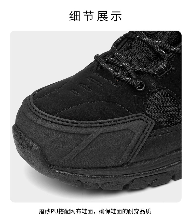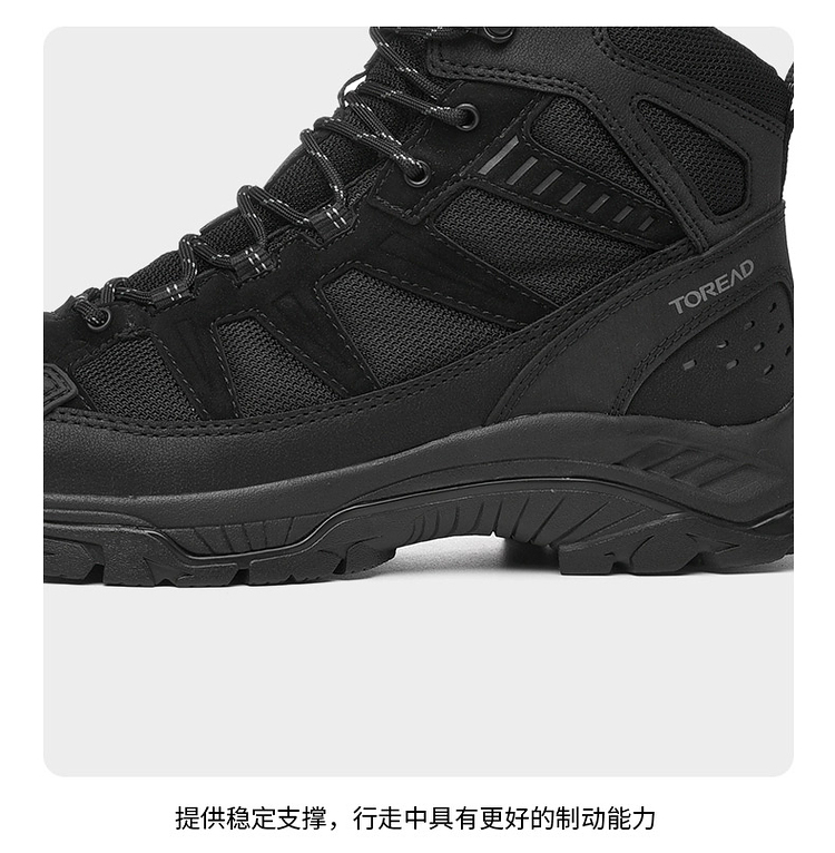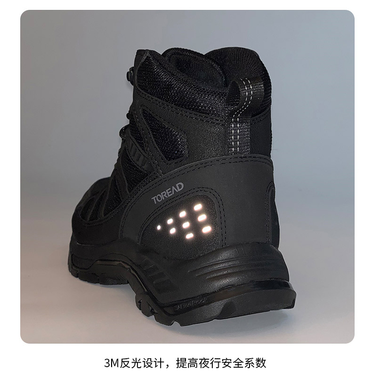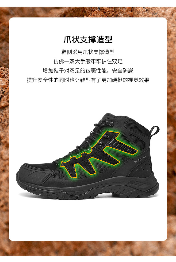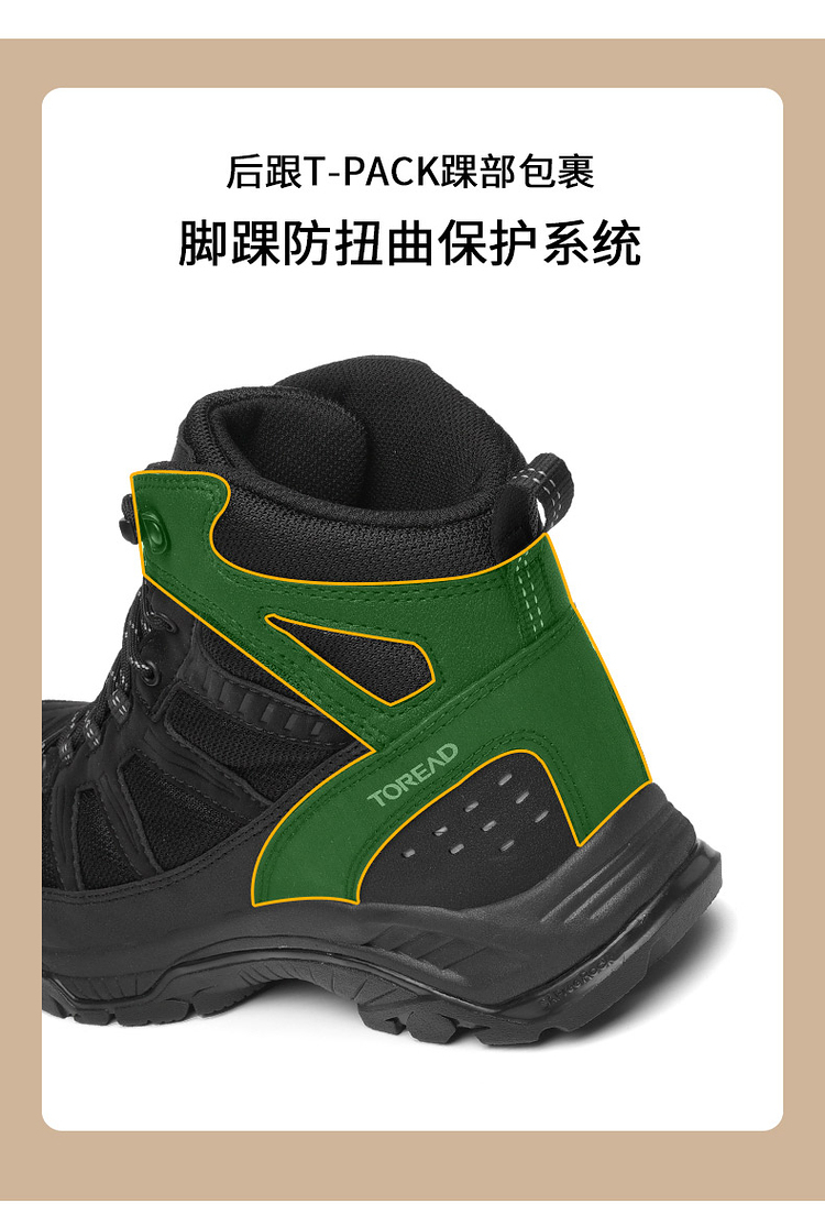 这款登山鞋的鞋面是磨砂超细纤维+网布材料,高强度、抗撕裂,兼顾透气、包裹和耐磨;侧面经典的爪型线条结构+后跟T-PACK护踝防扭转系统,可牢固的锁住鞋型,增强鞋子对双脚的包裹,安全防崴脚,提升安全性。