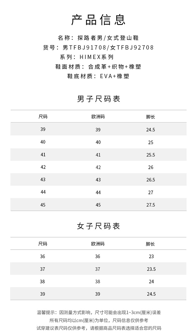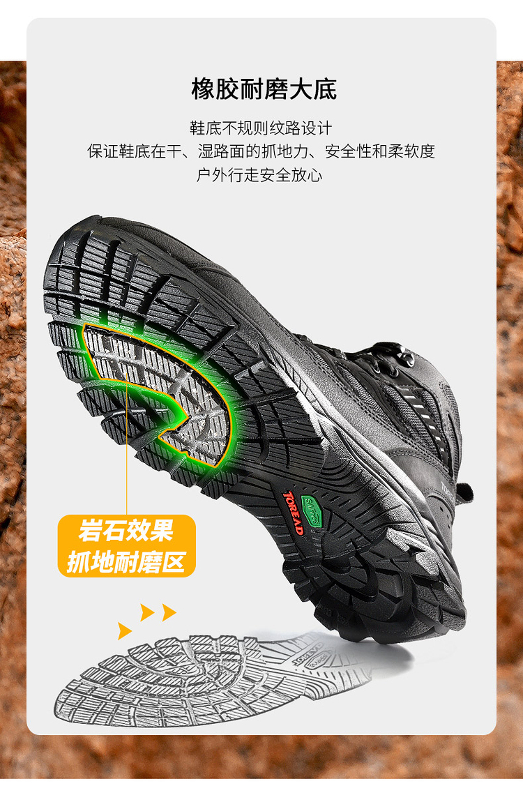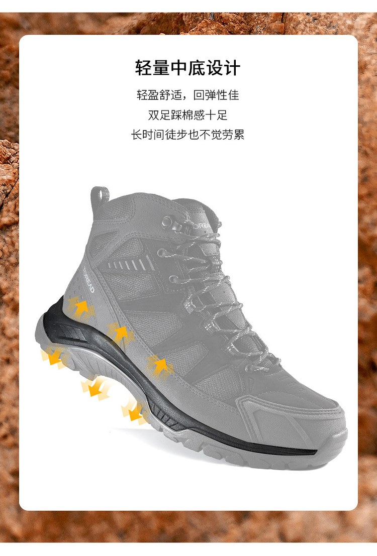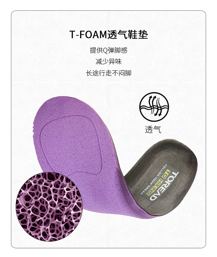 轻量化中底,轻盈回弹,长时间徒步也不觉劳累,耐磨橡胶大底+不规则纹路设计,抓地力非常强,即使是湿滑路面也能稳步前行。T-FORM防菌透气鞋垫,可提供Q弹脚感,舒适透气抗菌除臭,长时间行走不闷热,减少异味。