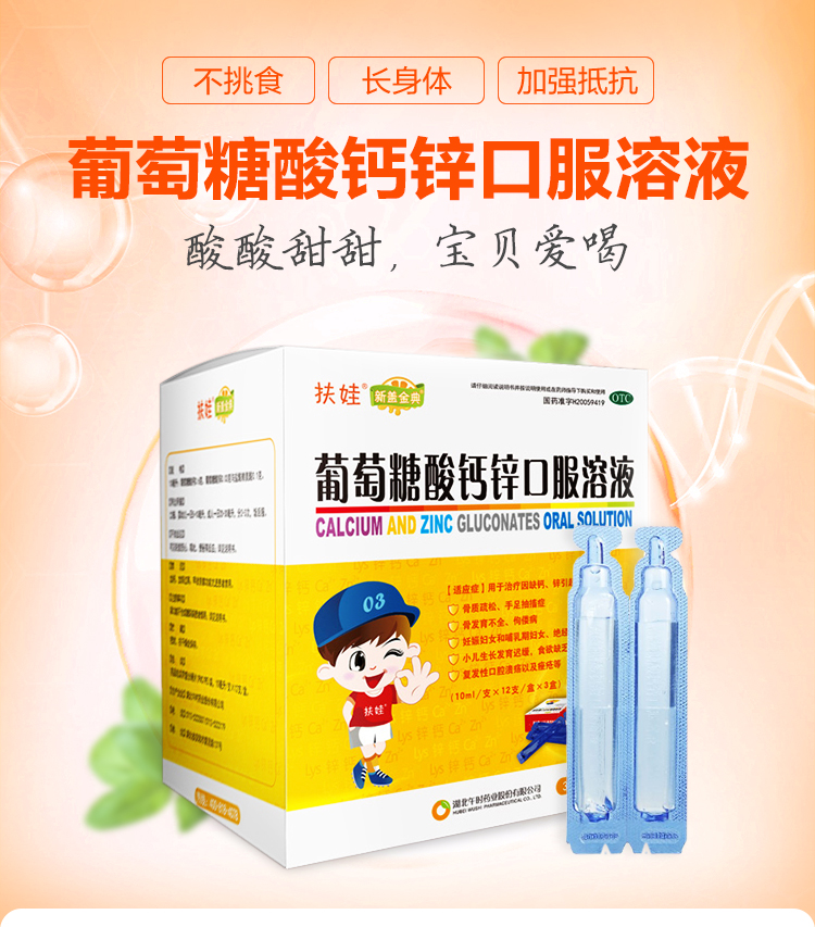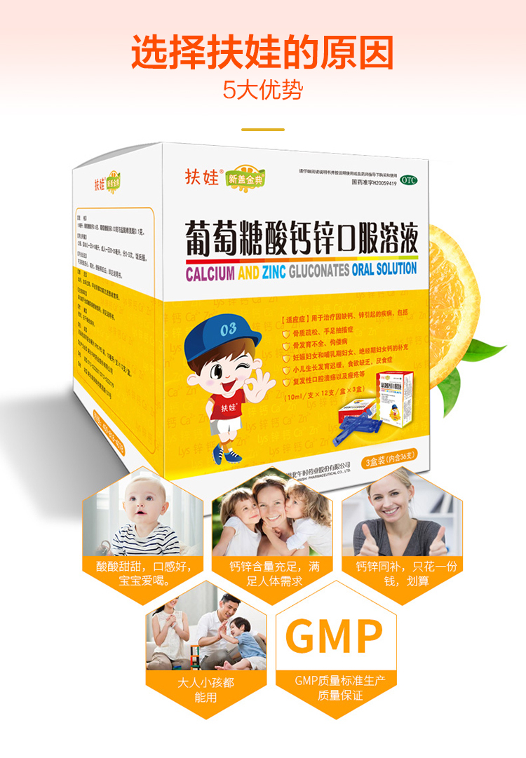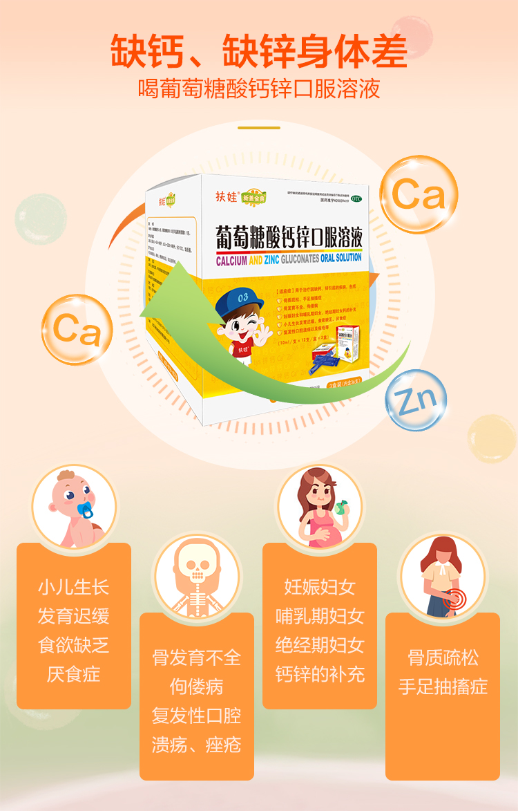 这款扶娃 葡萄糖酸钙锌口服液,获得了GMP质量标准生产质量保证,钙锌同补,均衡营养,酸甜甜橙口味,用于治疗因缺钙、锌引起的疾病,包括骨质疏松、手足抽搐症、骨发育不全、小儿生长发育迟缓、佝偻并妊 娠妇女和哺乳期妇女钙补充。