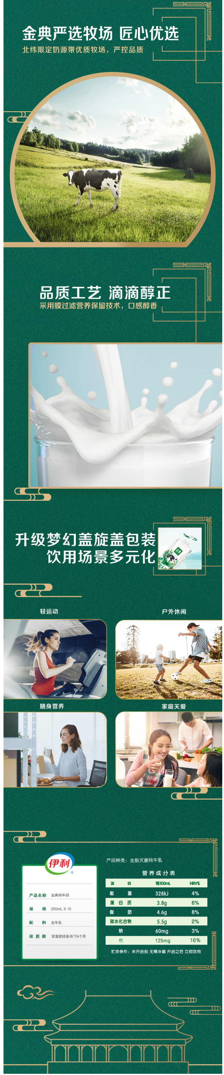 这款金典牛奶源自伊利甄选牧场,奶源无污染,确保绿色健康,每100ml含优质乳蛋白3.8g、原生高钙125mg,营养丰富,唇齿留香。