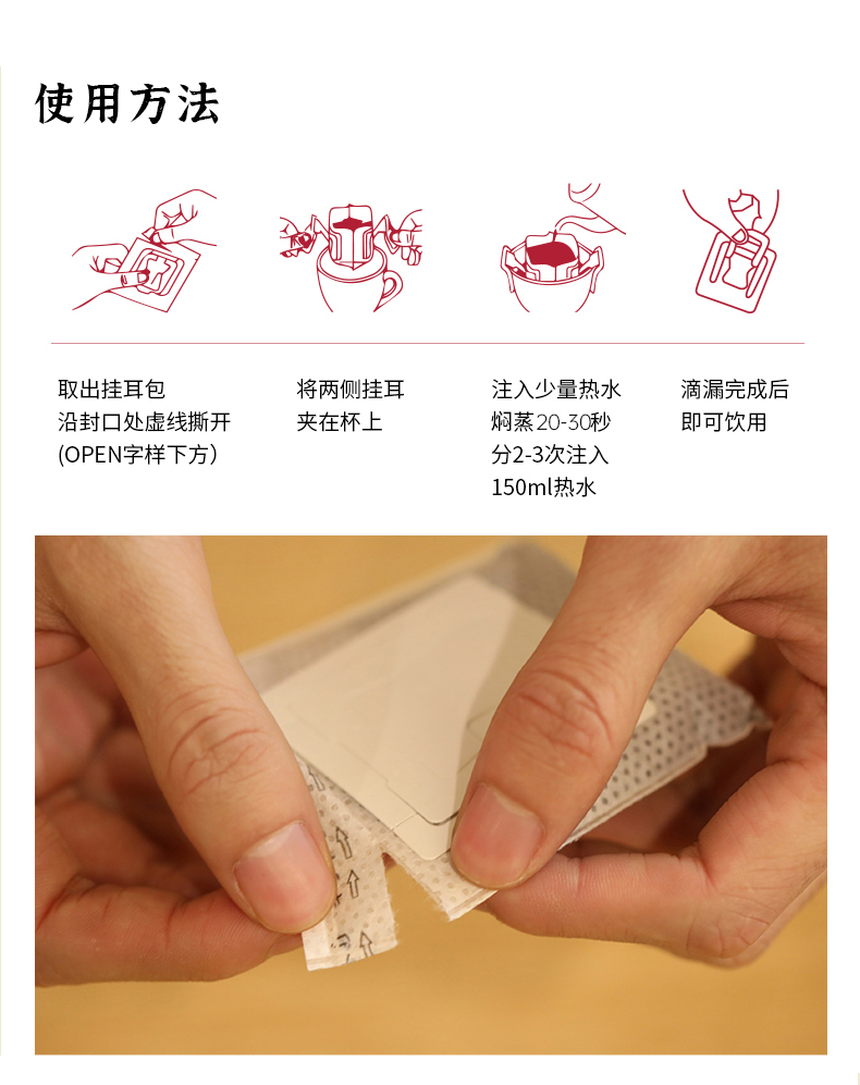 挂耳咖啡是用研磨好的咖啡粉放置在用无纺布制作的口袋里封装好,饮用的时候需要挂在杯口用开水冲泡就可以饮用,咖啡粉就可以直接扔掉了,糖和奶需要自己添加。这个咖啡是纯天然的,没加任何的添加剂。只要身边有热水水源,有杯子,即可方便享用,特别适合居家、办公室和旅行热人使用。
