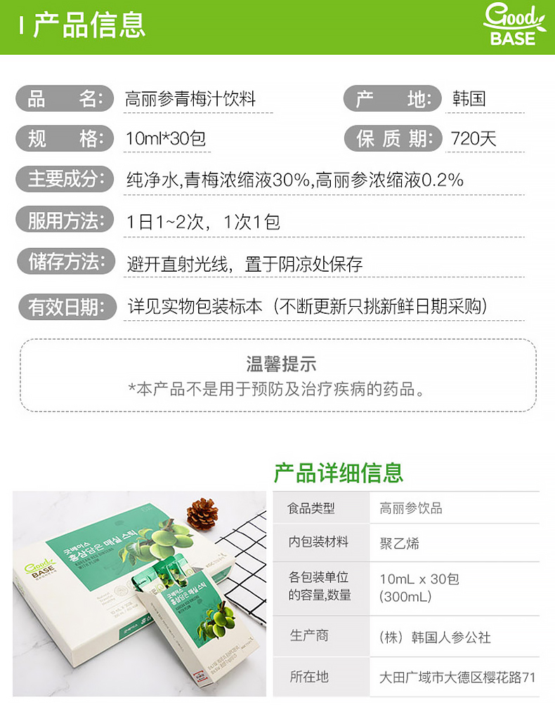 这款正官庄高丽参青梅浓缩液,韩国原装进口,由青梅浓缩液 30%、高丽参浓缩液0.2%、纯净水为原料制成,不添加糖、色素和合成香料,能改善新陈代谢,提高抵抗力增强体质、补充身体微量元素。