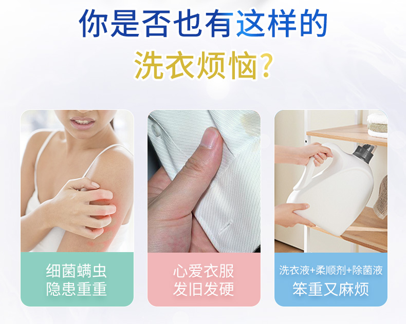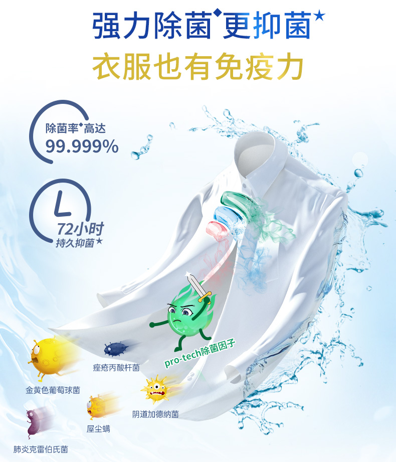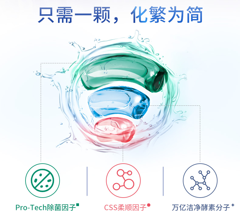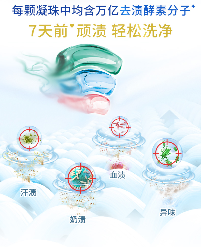 蓝色:万亿洁净酵素分子,轻松去除如奶渍、血渍、汗渍等。
