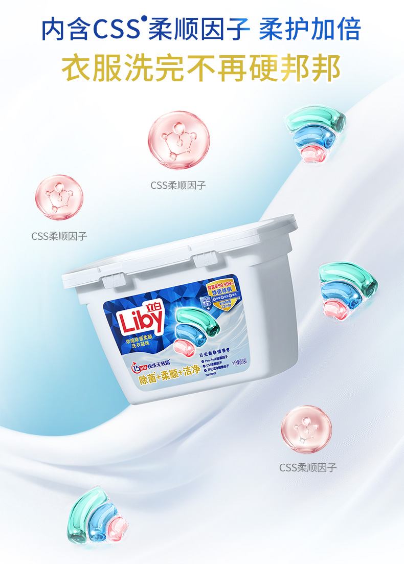 粉色:CSS柔顺因子、柔顺衣物持久留香,